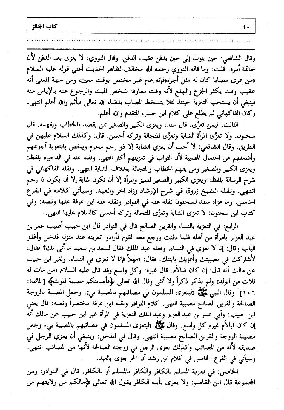 الثالث: فيمن تعزى قال سند: ويعزى الكبير والصغير ممن يقصد بالخطاب ويفهمه قال سحنون: ولا تعزى المرأة الشابة وتعزى المتجالة وتركه أحسن قال وكذلك السلام عليهن في الطريق وقال الشافعي: لا أحب أن يعزي الشابة إلا ذو رحم محرم ويخص بالتعزية أجزعهم وأضعفهم عن احتمال المصيبة لأن الثواب في تعزيتهم أكثر انتهى. ونقله عنه في الذخيرة بلفظ ويعزى الكبير والصغير ومن يفهم الخطاب والمتجالة بخلاف الشابة انتهى. ونقله الفاكهاني في شرح الرسالة بلفظ ويعزي الكبير والصغير المميز والمرأة إلا أن تكون شابة إلا أن يكون ذا رحم انتهى. ونقله الشيخ زروق في شرح الإرشاد وزاد الحر والعبد وسيأتي كلامه في الفرع الخامس وما عزاه سند لسحنون نقله عنه في النوادر ونقله عنه ابن عرفة عنها ونصه وفي كتاب ابن سحنون لا تعزى الشابة وتعزى المتجالة وتركه أحسن كالسلام عليها انتهى.