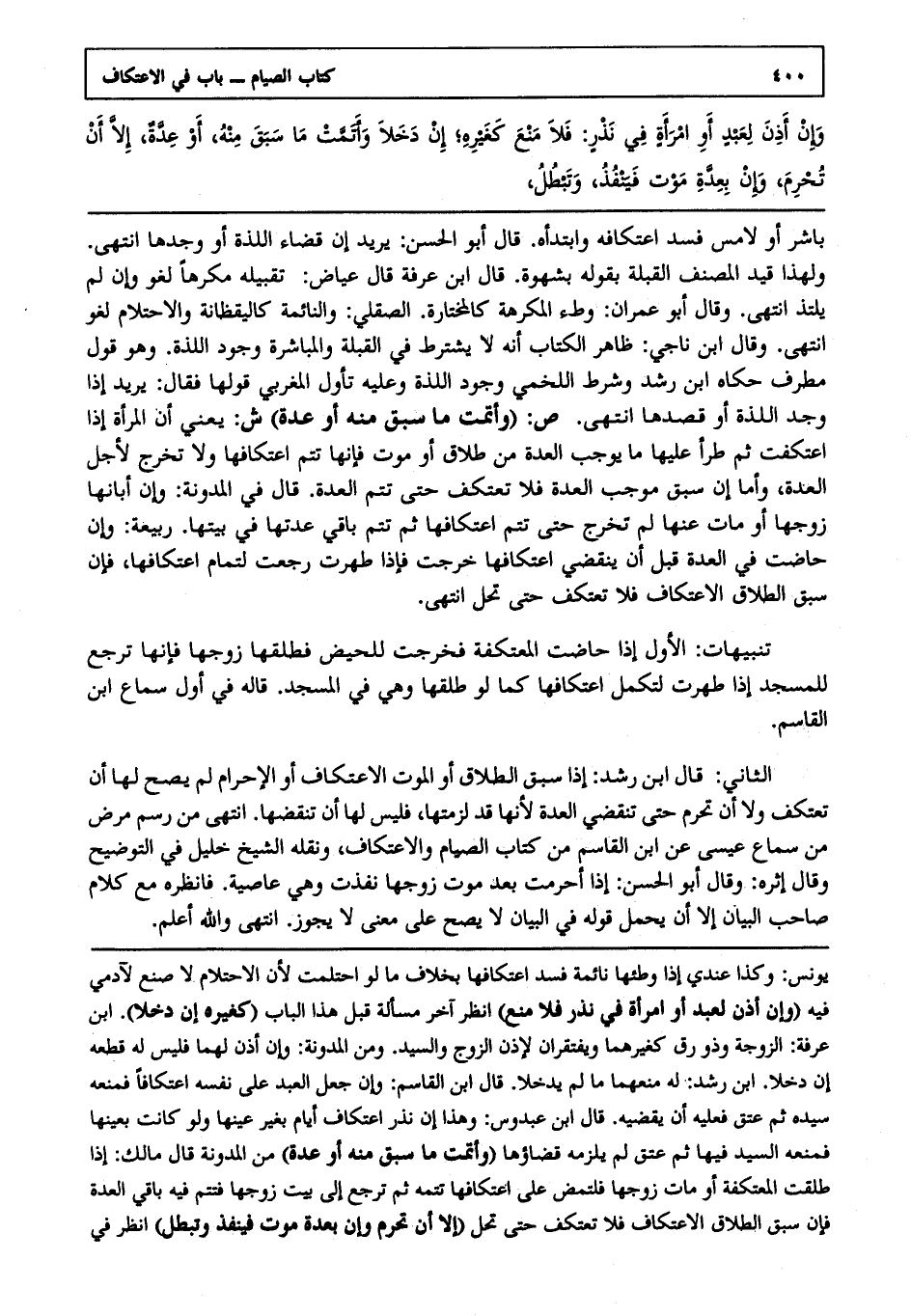 تنبيهات: الأول: إذا حاضت المعتكفة فخرجت للحيض فطلقها زوجها فإنها ترجع للمسجد إذا طهرت لتكمل اعتكافها كما لو طلقها وهي في المسجد قاله في أول سماع ابن القاسم.