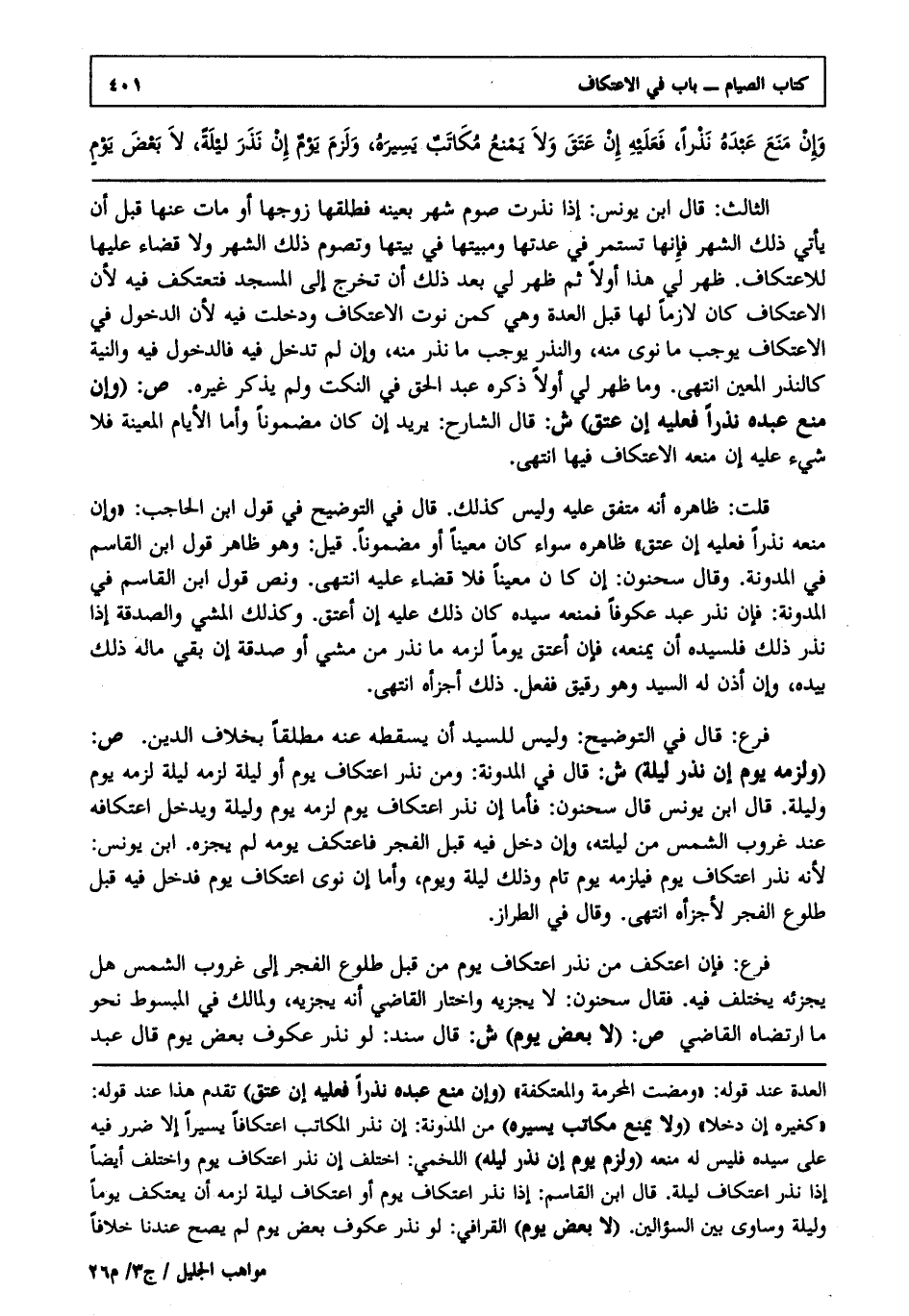 فرع: فإن اعتكف من نذر اعتكاف يوم من قبل طلوع الفجر إلى غروب الشمس هل يجزئه يختلف فيه فقال سحنون لا يجزيه واختار القاضي أنه يجزيه ولمالك في المبسوط نحو ما ارتضاه القاضي. ص: "لا بعض يوم". ش: قال سند: لو نذر عكوف بعض يوم قال عبد