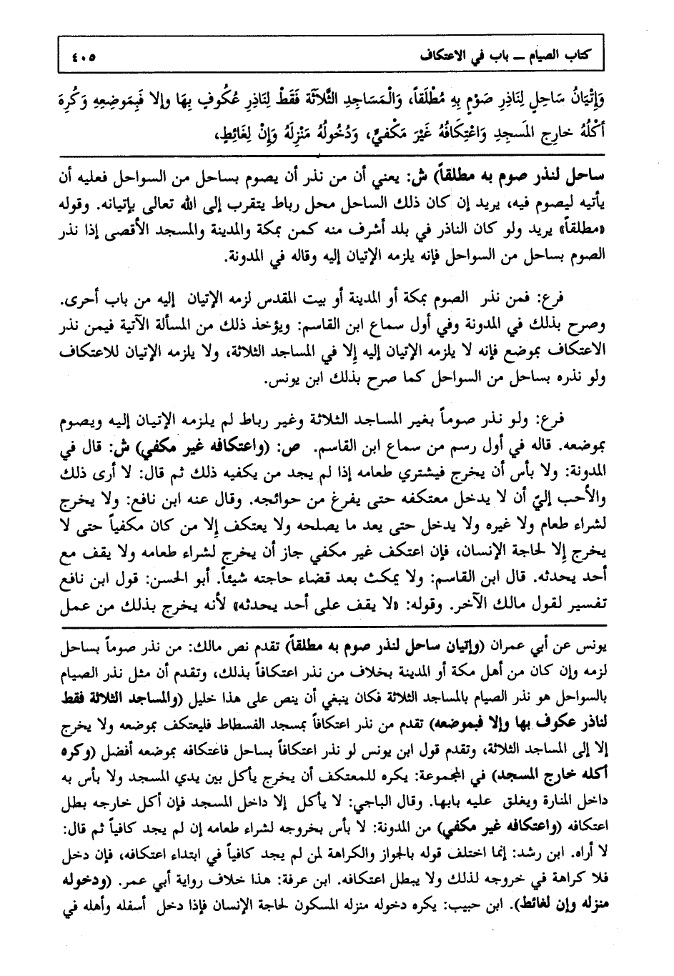 وإتيان ساحل لناذر صوم به مطلقاً والمساجد الثلاثة فقط لناذر عكوف بها وإلا فبموضوعه وكره أكله خارج المسجد واعتكاف غير مكفي ودخوله منزله وإن لغائط،