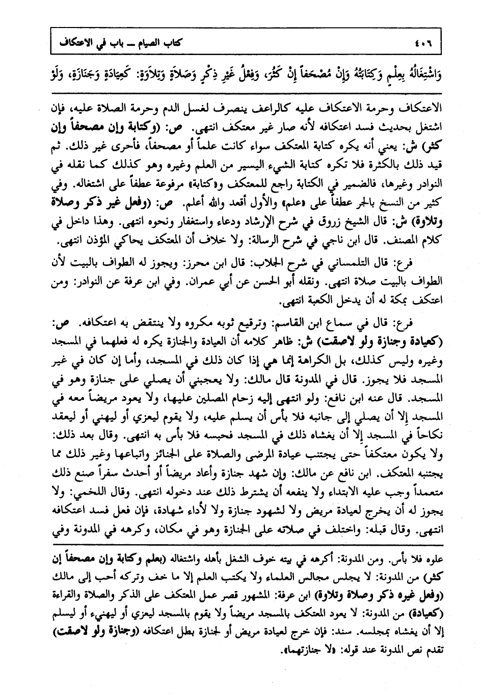 الاعتكاف وحرمة الاعتكاف عليه كالراعف ينصرف لغسل الدم وحرمة الصلاة عليه فإن اشتغل بحديث فسد اعتكافه لأنه صار غير معتكف انتهى. ص: "وكتابة وإن مصحفا وإن كثر". ش: يعني أنه يكره كتابة المعتكف سواء كانت علما أو مصحفا فأحرى غير ذلك ثم قيد ذلك بالكثرة فلا تكره كتابة الشيء اليسير من العلم وغيره وهو كذلك كما نقله في النوادر وغيرها فالضمير في الكتابة راجع للمعتكف وكتابة مرفوعة عطفا على اشتغاله وفي كثير من النسخ بالجر عطفا على علم والأول أقعد والله أعلم. ص: "وفعل غير ذكر وصلاة وتلاوة". ش: قال الشيخ زروق في شرح الإرشاد ودعاء واستغفار ونحوه انتهى. وهذا داخل في كلام المصنف قال ابن ناجي في شرح الرسالة ولا خلاف أن المعتكف يحاكي المؤذن انتهى.