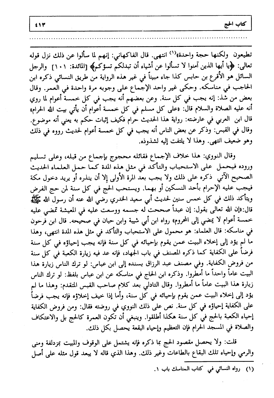 وقال النووي: هذا خلاف الإجماع فقائله محجوج بإجماع من قبله وعلى تسليم وروده فيحمل على الاستحباب والتأكد في مثل هذه المدة كما حمل العلماء الحديث الصحيح الآتي ذكره على ذلك ولا يجب بعد المرة الأولى إلا أن ينذره أو يريد دخول مكة فيجب عليه الإحرام بأحد النسكين أو بهما ويستحب الحج في كل سنة لمن حج الفرض ويتأكد ذلك في كل خمس سنين لحديث أبي سعيد الخدري رضي الله عنه أن رسول الله صلى الله عليه وسلم قال " إن الله تعالى يقول إن عبدا صححت له جسمه ووسعت عليه في المعيشة تمضي عليه خمسة أعوام لا يمضي إلى المحروم" رواه ابن أبي شيبة وابن حبان في صحيحه قال ابن فرحون في مناسكه: قال العلماء هو محمول على الاستحباب والتأكد في مثل هذه المدة انتهى. وهذا ما لم يؤد إلى إخلاء البيت عمن يقوم بإحيائه في كل سنة فإنه يجب إحياؤه في كل سنة فرضا على الكفاية كما ذكره المصنف في باب الجهاد فإنه عد فيه زيارة الكعبة في كل سنة من فروض الكفاية وفي مصنف عبد الرزاق بسنده إلى ابن عباس لو ترك الناس زيارة هذا البيت عاما واحدا ما أمطروا وذكره ابن الحاج في مناسكه عن ابن عباس بلفظ لو ترك الناس زيارة هذا البيت عاما ما أمطروا وقال التادلي بعد كلام صاحب القبس المتقدم وهذا ما لم يؤد إلى إخلاء البيت عمن يقوم بإحيائه في كل سنة وأما إذا خيف إخلاؤه فإنه يجب فرضا على الكفاية إحياؤه في كل سنة نص على ذلك النووي في روضته فقال ومن فروض الكفاية إحياء الكعبة بالحج في كل سنة هكذا أطلقوا وينبغي أن تكون العمرة كالحج بل والاعتكاف والصلاة في المسجد الحرام فإن التعظيم وإحياء البقعة يحصل بكل ذلك.