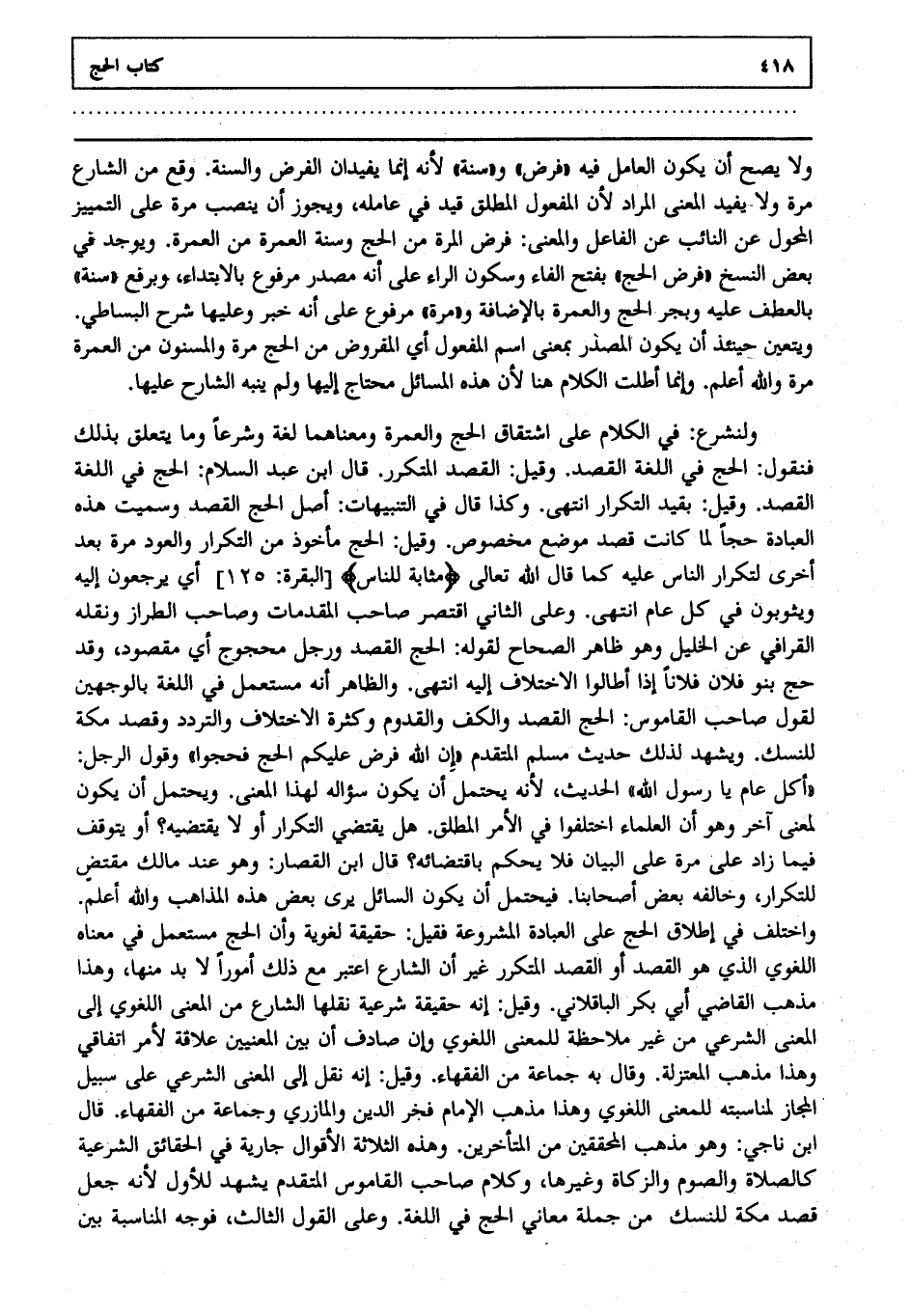 ولنشرع في الكلام على اشتقاق الحج والعمرة ومعناهما لغة وشرعا وما يتعلق بذلك فنقول الحج في اللغة القصد وقيل القصد المتكرر قال ابن عبد السلام: الحج في اللغة القصد وقيل بقيد التكرار انتهى. وكذا قال في التنبيهات أصل الحج القصد وسميت هذه العبادة حجا لما كانت قصد موضع مخصوص وقيل الحج مأخوذ من التكرار والعود مرة بعد أخرى لتكرار الناس عليه كما قال الله تعالى: {مَثَابَةً لِلنَّاسِ} [البقرة: 125] أي يرجعون إليه ويثوبون في كل عام انتهى. وعلى الثاني اقتصر صاحب المقدمات وصاحب الطراز ونقله القرافي عن الخليل وهو ظاهر الصحاح لقوله الحج القصد ورجل محجوج أي مقصود وقد حج بنو فلان فلانا إذا أطالوا الاختلاف إليه انتهى. والظاهر أنه مستعمل في اللغة بالوجهين لقول صاحب القاموس الحج القصد والكف والقدوم وكثرة الاختلاف والتردد وقصد مكة للنسك ويشهد لذلك حديث مسلم المتقدم إن الله فرض عليكم الحج فحجوا وقول الرجل أكل عام يا رسول الله الحديث لأنه يحتمل أن يكون سؤاله لهذا المعنى ويحتمل أن يكون لمعنى آخر وهو أن العلماء اختلفوا في الأمر المطلق هل يقتضي التكرار أو لا يقتضيه أو يتوقف فيما زاد على مرة على البيان فلا يحكم باقتضائه قال ابن القصار: وهو عند مالك مقتض للتكرار وخالفه بعض أصحابنا فيحتمل أن يكون السائل يرى بعض هذه المذاهب والله أعلم. واختلف في إطلاق الحج على العبادة المشروعة فقيل حقيقة لغوية وأن الحج مستعمل في معناه اللغوي الذي هو القصد أو القصد المتكرر غير أن الشارع اعتبر مع ذلك أمورا لا بد منها وهذا مذهب القاضي أبي بكر الباقلاني وقيل إنه حقيقة شرعية نقلها الشارع من المعنى اللغوي إلى المعنى الشرعي من غير ملاحظة للمعنى اللغوي وإن صادف أن بين المعنيين علاقة لأمر اتفاقي وهذا مذهب المعتزلة وقال به جماعة من الفقهاء وقيل إنه نقل إلى المعنى الشرعي على سبيل المجاز لمناسبته للمعنى اللغوي وهذا مذهب الإمام فخر الدين والمازري وجماعة من الفقهاء قال ابن ناجي وهو مذهب المحققين من المتأخرين وهذه الثلاثة الأقوال جارية في الحقائق الشرعية كالصلاة والصوم والزكاة وغيرها وكلام صاحب القاموس المتقدم يشهد للأول لأنه جعل قصد مكة للنسك من جملة معاني الحج في اللغة وعلى القول الثالث فوجه المناسبة بين