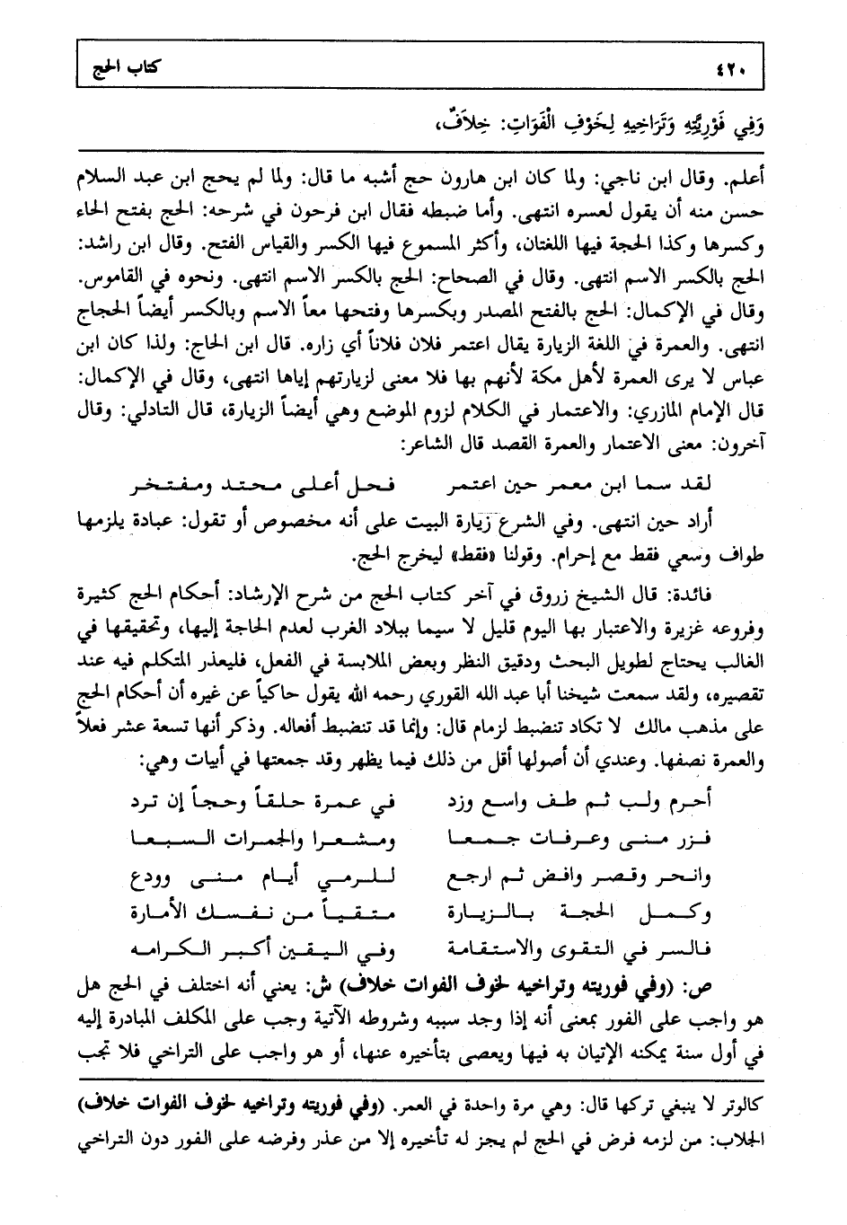 فائدة: قال الشيخ زروق في آخر كتاب الحج من شرح الإرشاد أحكام الحج كثيرة وفروعه غزيرة والاعتبار بها اليوم قليل لا سيما ببلاد الغرب لعدم الحاجة إليها وتحقيقها في الغالب يحتاج لطويل البحث ودقيق النظر وبعض الملابسة في الفعل فليعذر المتكلم فيه عند تقصيره ولقد سمعت شيخنا أبا عبد الله القوري رحمه الله يقول حاكيا عن غيره أن أحكام الحج على مذهب مالك لا تكاد تنضبط لزمام قال وإنما قد تنضبط أفعاله وذكر أنها تسعة عشر فعلا والعمرة نصفها وعندي أن أصولها أقل من ذلك فيما يظهر وقد جمعتها في أبيات وهي: