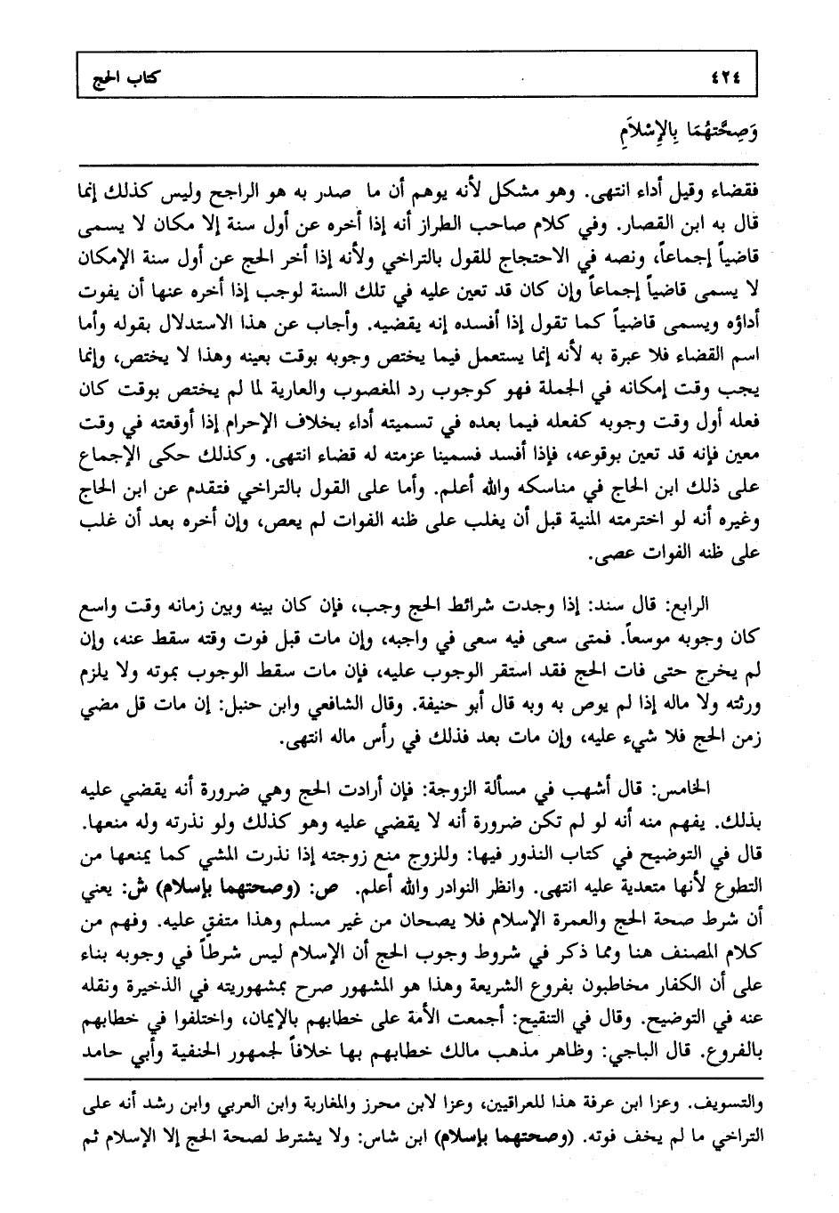 الرابع: قال سند: إذا وجدت شرائط الحج وجب فإن كان بينه وبين زمانه وقت واسع كان وجوبه موسعا فمتى سعى فيه سعى في واجبه وإن مات قبل فوت وقته سقط عنه وإن لم يخرج حتى فات الحج فقد استقر الوجوب عليه فإن مات سقط الوجوب بموته ولا يلزم ورثته ولا ماله إذا لم يوص به وبه قال أبو حنيفة وقال الشافعي وابن حنبل: إن مات قبل مضي زمن الحج فلا شيء عليه وإن مات بعد فذلك في رأس ماله انتهى. الخامس: قال أشهب في مسألة الزوجة: فإن أرادت الحج وهي صرورة أنه يقضي عليه بذلك يفهم منه أنه لو لم تكن صرورة أنه لا يقضي عليه وهو كذلك ولو نذرته وله منعها قال في التوضيح: في كتاب النذور فيها وللزوج منع زوجته إذا نذرت المشي كما يمنعها من التطوع لأنها متعدية عليه انتهى. وانظر النوادر والله أعلم.. ص: "وصحتهما بإسلام". ش: يعني أن شرط صحة الحج والعمرة الإسلام فلا يصحان من غير مسلم وهذا متفق عليه وفهم من كلام المصنف هنا ومما ذكر في شروط وجوب الحج أن الإسلام ليس شرطا في وجوبه بناء على أن الكفار مخاطبون بفروع الشريعة وهذا هو المشهور صرح بمشهوريته في الذخيرة ونقله عنه في التوضيح وقال في التنقيح أجمعت الأمة على خطابهم بالإيمان واختلفوا في خطابهم بالفروع قال الباجي وظاهر مذهب مالك خطابهم بها خلافا لجمهور الحنفية وأبي حامد