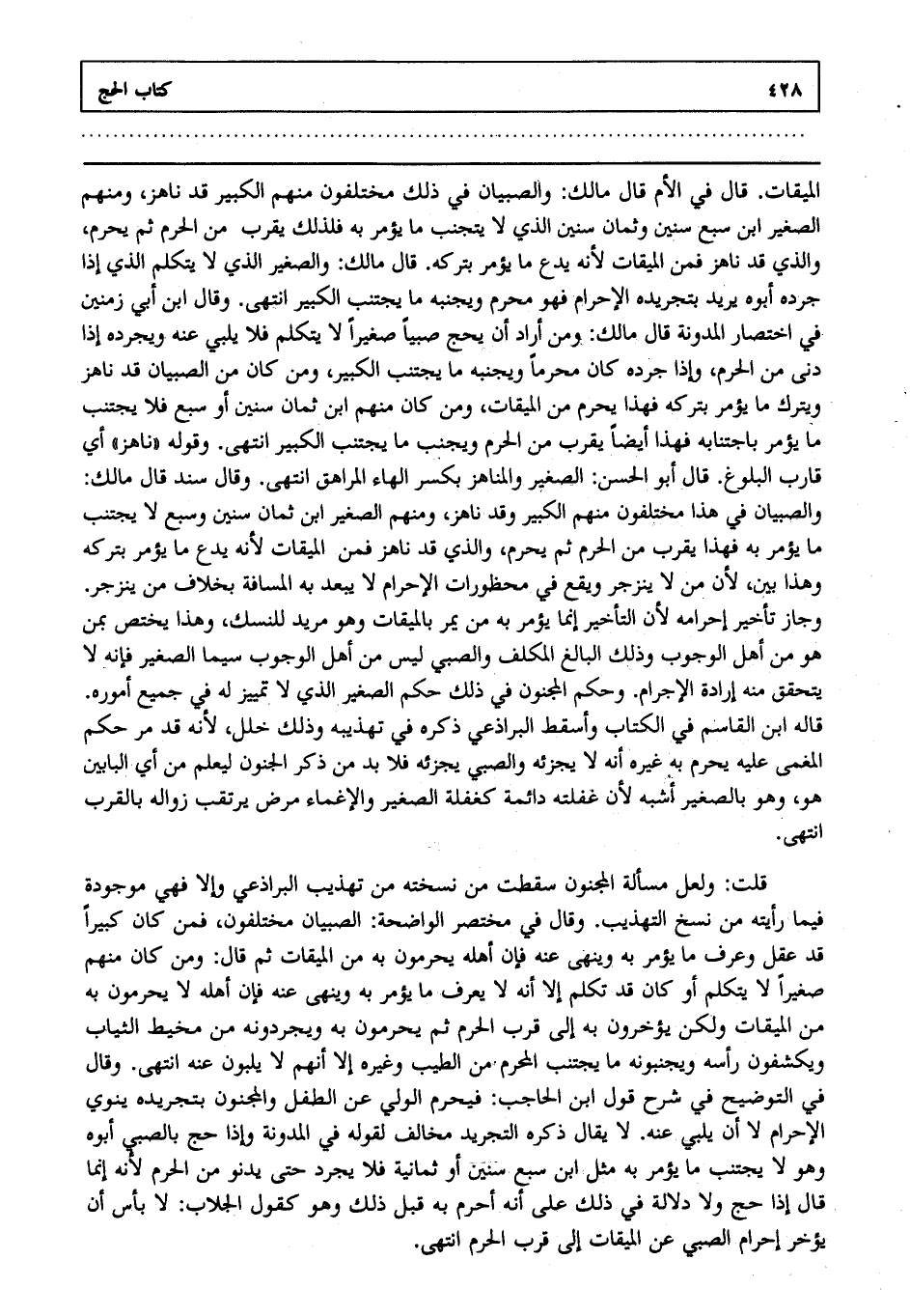 قلت: ولعل مسألة المجنون سقطت من نسخته من تهذيب البراذعي وإلا فهي موجودة فيما رأيته من نسخ التهذيب وقال في مختصر الواضحة الصبيان مختلفون فمن كان كبيرا قد عقل وعرف ما يؤمر به وينهى عنه فإن أهله يحرمون به من الميقات ثم قال ومن كان منهم صغيرا لا يتكلم أو كان قد تكلم إلا أنه لا يعرف ما يؤمر به وينهى عنه فإن أهله لا يحرمون به من الميقات ولكن يؤخرون به إلى قرب الحرم ثم يحرمون به ويجردونه من مخيط الثياب ويكشفون رأسه ويجنبونه ما يجتنب المحرم من الطيب وغيره إلا أنهم لا يلبون عنه انتهى. و قال في التوضيح: في شرح قول ابن الحاجب فيحرم الولي عن الطفل والمجنون بتجريده ينوي الإحرام لا أن يلبي عنه لا يقال ذكره التجريد مخالف لقوله في المدونة وإذا حج بالصبي أبوه وهو لا يجتنب ما يؤمر به مثل ابن سبع سنين أو ثمانية فلا يجرد حتى يدنو من الحرم لأنه إنما قال إذا حج ولا دلالة في ذلك على أنه أحرم به قبل ذلك وهو كقول الجلاب لا بأس أن يؤخر إحرام الصبي عن الميقات إلى قرب الحرم انتهى.