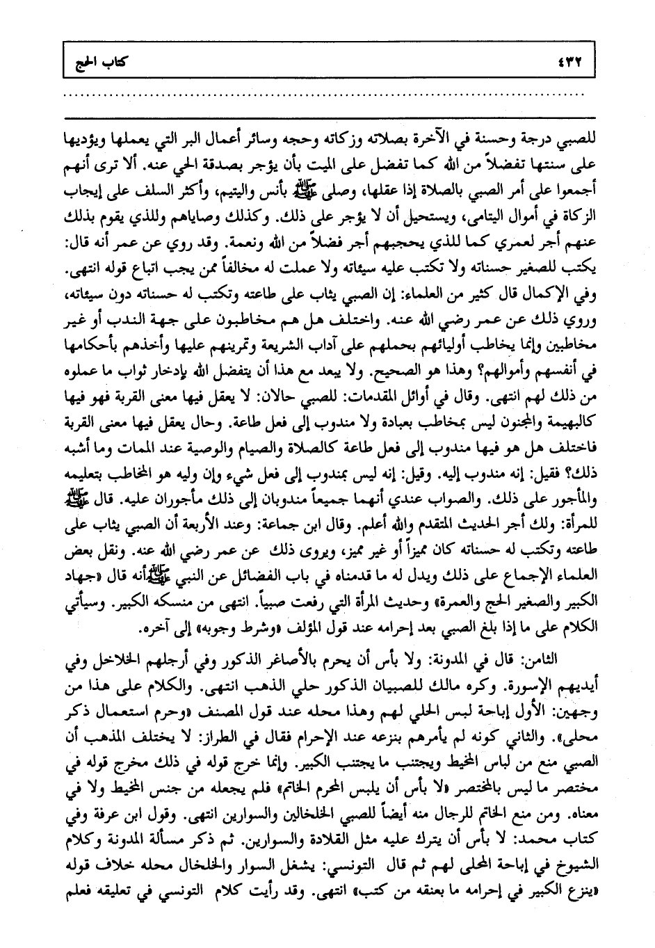 الثامن: قال في المدونة: ولا بأس أن يحرم بالأصاغر الذكور وفي أرجلهم الخلاخل وفي أيديهم الأسورة وكره مالك للصبيان الذكور حلي الذهب انتهى. والكلام على هذا من وجهين الأول إباحة لبس الحلي لهم وهذا محله عند قول المصنف وحرم استعمال ذكر محلى والثاني كونه لم يأمرهم بنزعه عند الإحرام فقال في الطراز لا يختلف المذهب أن الصبي منع من لباس المخيط ويجتنب ما يجتنب الكبير وإنما خرج قوله في ذلك مخرج قوله في مختصر ما ليس بالمختصر لا بأس أن يلبس المحرم الخاتم فلم يجعله من جنس المخيط ولا في معناه ومن منع الخاتم للرجال منعه أيضا للصبي الخلخالين والسوارين انتهى. وقول ابن عرفة وفي كتاب محمد لا بأس أن يترك عليه مثل القلادة والسوارين ثم ذكر مسألة المدونة وكلام الشيوخ في إباحة المحلى لهم ثم قال التونسي يشغل السوار والخلخال محله خلاف قوله: ينزع الكبير في إحرامه ما بعنقه من كتب انتهى. وقد رأيت كلام التونسي في تعليقه فعلم