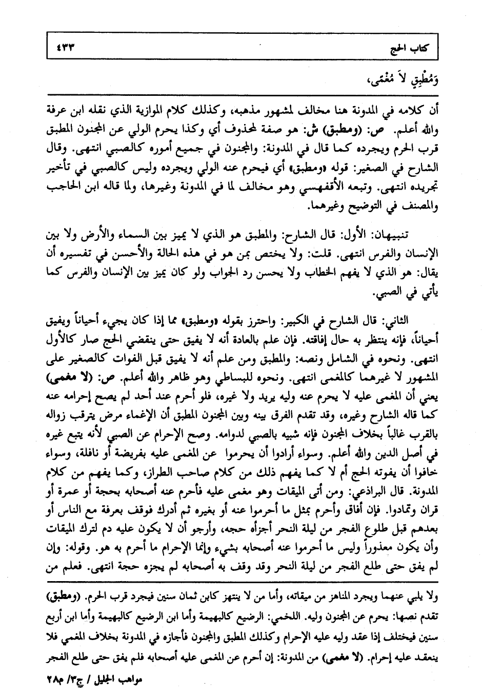أن كلامه في المدونة هنا مخالف لمشهور مذهبه وكذلك كلام الموازية الذي نقله ابن عرفة والله أعلم. ص: "ومطبق". ش: هو صفة لمحذوف أي وكذا يحرم الولي عن المجنون المطبق قرب الحرم ويجرده كما قال في المدونة والمجنون في جميع أموره كالصبي انتهى. وقال الشارح في الصغير قوله: ومطبق أي فيحرم عنه الولي ويجرده وليس كالصبي في تأخير تجريده انتهى. وتبعه الأقفهسي وهو مخالف لما في المدونة وغيرها ولما قاله ابن الحاجب والمصنف في التوضيح وغيرهما.