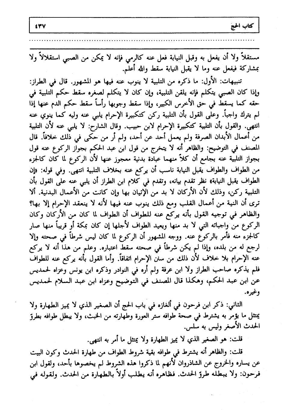 الثاني: ذكر ابن فرحون في ألغازه في باب الحج أن الصغير الذي لا يميز الطهارة ولا يمتثل ما يؤمر به يشترط في صحة طوافه ستر العورة وطهارته من الخبث ولا يبطل طوافه بطرو الحدث الأصغر وليس به سلس.