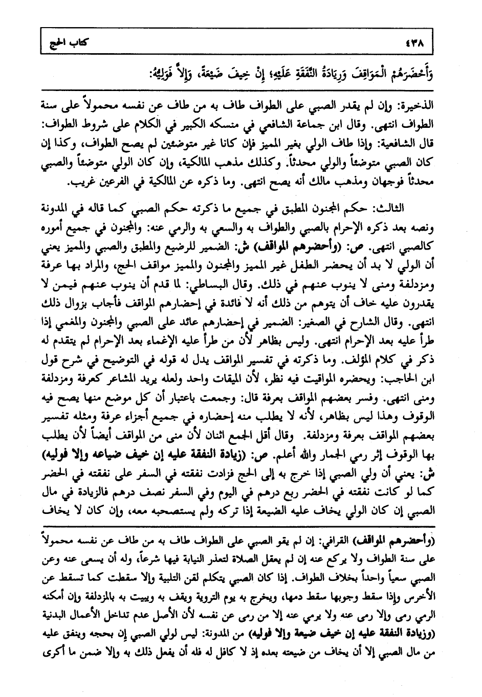 الثالث: حكم المجنون المطبق في جميع ما ذكرته حكم الصبي كما قاله في المدونة ونصه بعد ذكره الإحرام بالصبي والطواف به والسعي به والرمي عنه والمجنون في جميع أموره كالصبي انتهى. ص: "وأحضرهم المواقف". ش: الضمير للرضيع والمطبق والصبي والمميز يعني أن الولي لا بد أن يحضر الطفل غير المميز والمجنون والمميز مواقف الحج والمراد بها عرفة ومزدلفة ومنى لا ينوب عنهم في ذلك وقال البساطي لما قدم أن ينوب عنهم فيمن لا يقدرون عليه خاف أن يتوهم من ذلك أنه لا فائدة في إحضارهم المواقف فأجاب بزوال ذلك انتهى. وقال الشارح في الصغير الضمير في إحضارهم عائد على الصبي والمجنون والمغمي إذا طرأ عليه بعد الإحرام انتهى. وليس بظاهر لأن من طرأ عليه الإغماء بعد الإحرام لم يتقدم له ذكر في كلام المؤلف وما ذكرته في تفسير المواقف يدل له قوله في التوضيح في شرح قول ابن الحاجب: ويحضره المواقيت فيه نظر لأن الميقات واحد ولعله يريد المشاعر كعرفة ومزدلفة ومنى انتهى. وفسر بعضهم المواقف بعرفة قال وجمعت باعتبار أن كل موضع منها يصح فيه الوقوف وهذا ليس بظاهر لأنه لا يطلب منه إحضاره في جميع أجزاء عرفة ومثله تفسير بعضهم المواقف بعرفة ومزدلفة وقال أقل الجمع اثنان لأن منى من المواقف أيضا لأن يطلب بها الوقوف إثر رمي الجمار والله أعلم. ص: "زيادة النفقة عليه إن خيف ضياعه وإلا فوليه". ش: يعني أن ولي الصبي إذا خرج به إلى الحج فزادت نفقته في السفر على نفقته في الحضر كما لو كانت نفقته في الحضر ربع درهم في اليوم وفي السفر نصف درهم فالزيادة في مال الصبي إن كان الولي يخاف عليه الضيعة إذا تركه ولم يستصحبه معه وإن كان لا يخاف