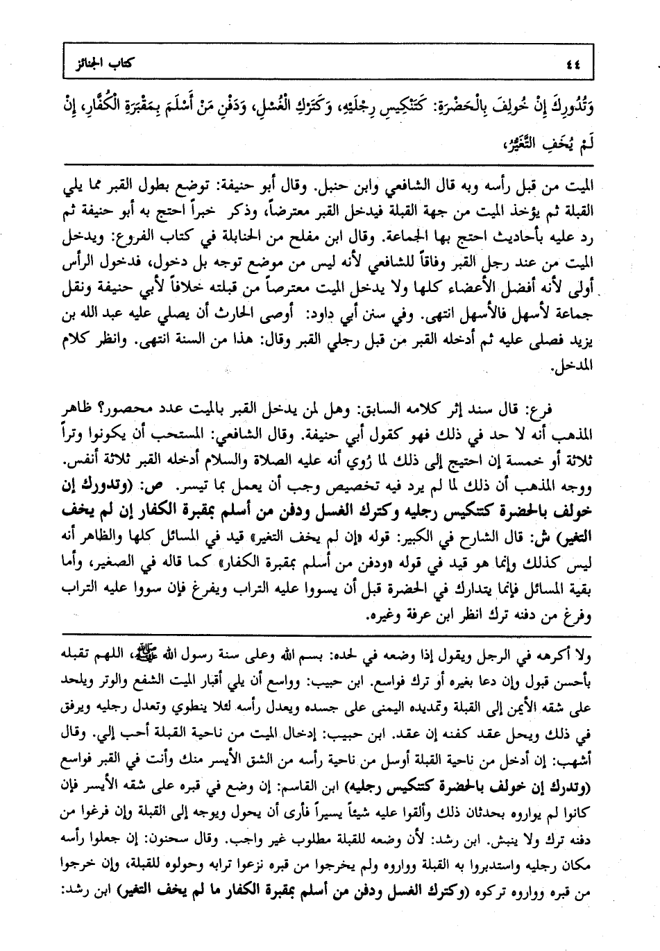 فرع: قال سند إثر كلامه السابق: وهل لمن يدخل القبر بالميت عدد محصور ظاهر المذهب أنه لا حد في ذلك فهو كقول أبي حنيفة وقال الشافعي: المستحب أن يكونوا وترا ثلاثة أو خمسة إن احتيج إلى ذلك لما روي أنه عليه الصلاة والسلام أدخله القبر ثلاثة أنفس ووجه المذهب أن ذلك لما لم يرد فيه تخصيص وجب أن يعمل بما تيسر. ص: "وتدورك إن خولف بالحضرة كتنكيس رجليه وكترك الغسل ودفن من أسلم بمقبرة الكفار إن لم يخف التغير". ش: قال الشارح في الكبير: قوله: إن لم يخف التغير قيد في المسائل كلها والظاهر أنه ليس كذلك وإنما هو قيد في قوله: ودفن من أسلم بمقبرة الكفار كما قاله في الصغير وأما بقية المسائل فإنما يتدارك في الحضرة قبل أن يسووا عليه التراب ويفرغ فإن سووا عليه التراب وفرغ من دفنه ترك انظر ابن عرفة وغيره.