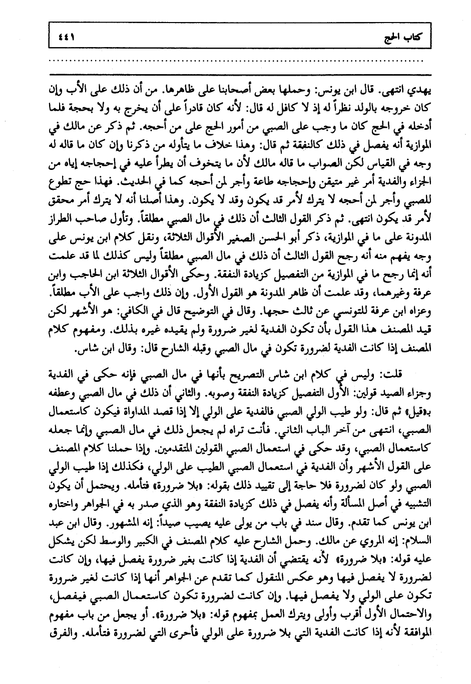 يهدي انتهى. قال ابن يونس: وحملها بعض أصحابنا على ظاهرها من أن ذلك على الأب وإن كان خروجه بالولد نظرا له إذ لا كافل له قال لأنه كان قادرا على أن يخرج به ولا بحجة فلما أدخله في الحج كان ما وجب على الصبي من أمور الحج على من أحجه ثم ذكر عن مالك في الموازية أنه يفصل في ذلك كالنفقة ثم قال وهذا خلاف ما يتأوله من ذكرنا وإن كان ما قاله له وجه في القياس لكن الصواب ما قاله مالك لأن ما يتخوف أن يطرأ عليه في إحجاجه إياه من الجزاء والفدية أمر غير متيقن وإحجاجه طاعة وأجر لمن أحجه كما في الحديث فهذا حج تطوع للصبي وأجر لمن أحجه لا يترك لأمر قد يكون وقد لا يكون وهذا أصلنا أنه لا يترك أمر محقق لأمر قد يكون انتهى. ثم ذكر القول الثالث أن ذلك في مال الصبي مطلقا وتأول صاحب الطراز المدونة على ما في الموازية ذكر أبو الحسن الصغير الأقوال الثلاثة ونقل كلام ابن يونس على وجه يفهم منه أنه رجح القول الثالث أن ذلك في مال الصبي مطلقا وليس كذلك لما قد علمت أنه إنما رجح ما في الموازية من التفصيل كزيادة النفقة وحكى الأقوال الثلاثة ابن الحاجب وابن عرفة وغيرهما وقد علمت أن ظاهر المدونة هو القول الأول وإن ذلك واجب على الأب مطلقا وعزاه ابن عرفة للتونسي عن ثالث حجها و قال في التوضيح: قال في الكافي هو الأشهر لكن قيد المصنف هذا القول بأن تكون الفدية لغير ضرورة ولم يقيده غيره بذلك ومفهوم كلام المصنف إذا كانت الفدية لضرورة تكون في مال الصبي وقبله الشارح قال وقال ابن شاس.