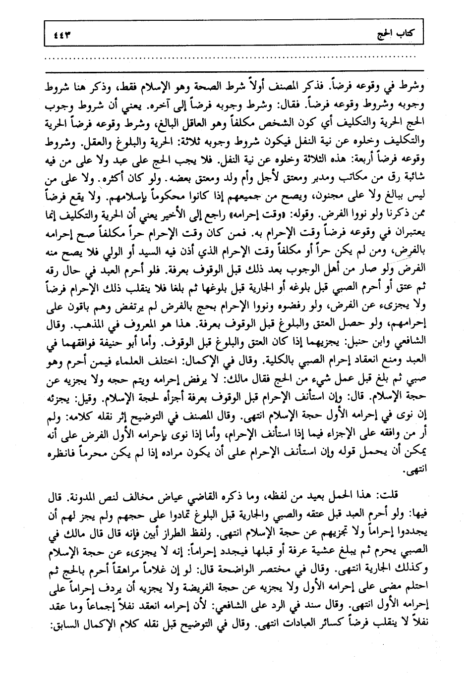 قلت: هذا الحمل بعيد من لفظه وما ذكره القاضي عياض مخالف لنص المدونة قال فيها ولو أحرم العبد قبل عتقه والصبي والجارية قبل البلوغ تمادوا على حجهم ولم يجز لهم أن يجددوا إحراما ولا تجزيهم عن حجة الإسلام انتهى. ولفظ الطراز أبين فإنه قال: قال مالك في الصبي يحرم ثم يبلغ عشية عرفة أو قبلها فيجدد إحراما: إنه لا يجزئ عن حجة الإسلام وكذلك الجارية انتهى. وَقَالَ فِي مُخْتَصَرِ الْوَاضِحَةِ: قَالَ: لَوْ أَنَّ غُلَامًا مُرَاهِقًا أَحْرَمَ بِالْحَجِّ ثُمَّ احْتَلَمَ مَضَى عَلَى إحْرَامِهِ الْأَوَّلِ وَلَا يُجْزِيهِ عَنْ حَجَّةِ الْفَرِيضَةِ وَلَا يُجْزِيهِ أَنْ يُرْدِفَ إحْرَامًا عَلَى إحْرَامِهِ الْأَوَّلِ انتهى. . وَقَالَ سَنَدٌ فِي الرَّدِّ عَلَى الشَّافِعِيِّ: لِأَنَّ إحْرَامَهُ انْعَقَدَ نَفْلًا إجْمَاعًا وَمَا عُقِدَ نَفْلًا لَا يَنْقَلِبُ فَرْضًا كَسَائِرِ الْعِبَادَاتِ انتهى. . وَ قال في التوضيح: قَبْلَ نَقْلِهِ كَلَامَ الْإِكْمَالِ السَّابِقِ: