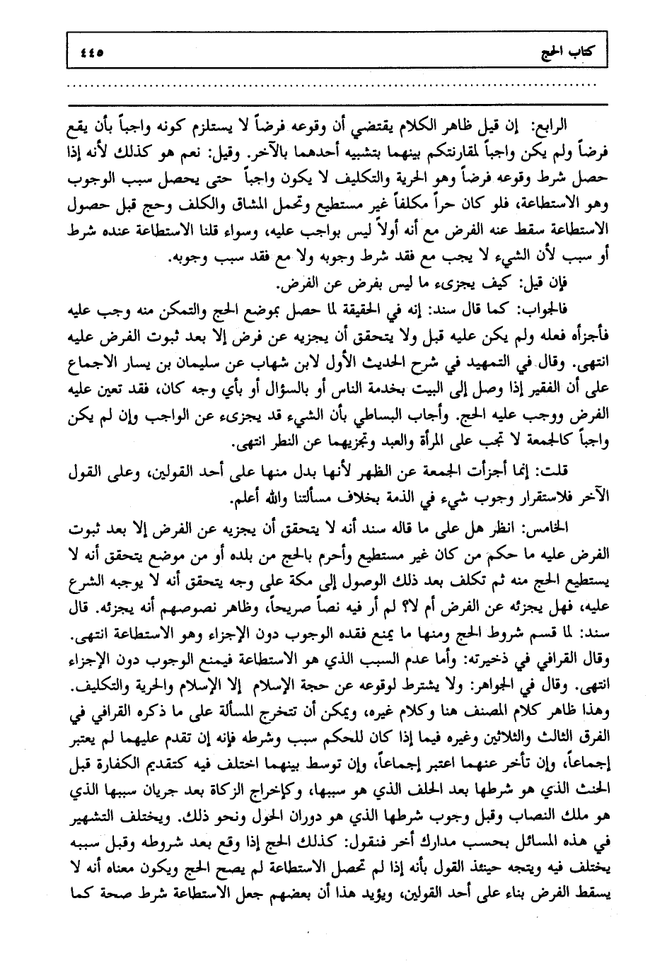 الخامس: انظر هل على ما قاله سند أنه لا يتحقق أن يجزيه عن الفرض إلا بعد ثبوت الفرض عليه , ما حكم من كان غير مستطيع وأحرم بالحج من بلده أو من موضع يتحقق أنه لا يستطيع الحج منه ثم تكلف بعد ذلك الوصول إلى مكة على وجه يتحقق أنه لا يوجبه الشرع عليه فهل يجزئه عن الفرض أم لا ؟ لم أر فيه نصا صريحا وظاهر نصوصهم أنه يجزئه , قال سند: لما قسم شروط الحج ومنها ما يمنع فقده الوجوب دون الإجزاء وهو الاستطاعة انتهى. . وقال القرافي في ذخيرته: وأما عدم السبب الذي هو الاستطاعة فيمنع الوجوب دون الإجزاء انتهى. وقال في الجواهر: ولا يشترط لوقوعه عن حجة الإسلام إلا الإسلام والحرية والتكليف وهذا ظاهر كلام المصنف هنا وكلام غيره ويمكن أن تتخرج المسألة على ما ذكره القرافي في الفرق الثالث والثلاثين وغيره فيما إذا كان للحكم سبب وشرط فإنه إن تقدم عليهما لم يعتبر إجماعا وإن تأخر عنهما اعتبر إجماعا وإن توسط بينهما اختلف فيه كتقديم الكفارة قبل الحنث الذي هو شرطها بعد الحلف الذي هو سببها وكإخراج الزكاة بعد جريان سببها الذي هو ملك النصاب , وقبل وجوب شرطها الذي هو دوران الحول ونحو ذلك ويختلف التشهير في هذه المسائل بحسب مدارك أخر , فنقول: كذلك الحج إذا وقع بعد شروطه وقبل سببه يختلف فيه ويتجه حينئذ القول بأنه إذا لم تحصل الاستطاعة لم يصح الحج ويكون معناه أنه لا يسقط الفرض بناء على أحد القولين ويؤيد هذا أن بعضهم جعل الاستطاعة شرط صحة كما