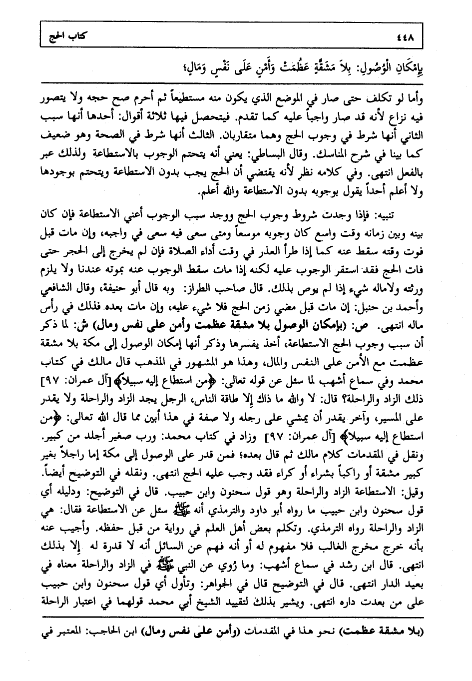 تنبيه: فإذا وجدت شروط وجوب الحج ووجد سبب الوجوب أعني الاستطاعة فإن كان بينه وبين زمانه وقت واسع كان وجوبه موسعا ومتى سعى فيه سعى في واجبه وإن مات قبل فوت وقته سقط عنه كما إذا طرأ العذر في وقت أداء الصلاة فإن لم يخرج إلى الحجر حتى فات الحج فقد استقر الوجوب عليه لكنه إذا مات سقط الوجوب عنه بموته عندنا ولا يلزم ورثته ولا ماله شيء إذا لم يوص بذلك قال صاحب الطراز وبه قال أبو حنيفة وقال الشافعي وأحمد بن حنبل: إن مات قبل مضي زمن الحج فلا شيء عليه وإن مات بعده فذلك في رأس ماله انتهى. ص: "بإمكان الوصول بلا مشقة عظمت وأمن على نفس ومال". ش: لما ذكر أن سبب وجوب الحج الاستطاعة أخذ يفسرها وذكر أنها إمكان الوصول إلى مكة بلا مشقة عظمت مع الأمن على النفس والمال وهذا هو المشهور في المذهب قال مالك في كتاب محمد وفي سماع أشهب لما سئل عن قوله تعالى: {مَنِ اسْتَطَاعَ إِلَيْهِ سَبِيلاً} [آل عمران: 97] ذلك الزاد والراحلة قال: لا والله ما ذاك إلا طاقة الناس الرجل يجد الزاد والراحلة ولا يقدر على المسير وآخر يقدر أن يمشي على رجله ولا صفة في هذا أبين مما قال الله تعالى: {مَنِ اسْتَطَاعَ إِلَيْهِ سَبِيلاً} [آل عمران: 97] وزاد في كتاب محمد ورب صغير أجلد من كبير ونقل في المقدمات كلام مالك ثم قال بعده فمن قدر على الوصول إلى مكة إما راجلا بغير كبير مشقة أو راكبا بشراء أو كراء فقد وجب عليه الحج انتهى. ونقله في التوضيح أيضا وقيل الاستطاعة الزاد والراحلة وهو قول سحنون وابن حبيب قال في التوضيح: ودليله أي قول سحنون وابن حبيب ما رواه أبو داود والترمذي أنه صلى الله عليه وسلم سئل عن الاستطاعة فقال هي الزاد والراحلة رواه الترمذي وتكلم بعض أهل العلم في رواية من قبل حفظه وأجيب عنه بأنه خرج مخرج الغالب فلا مفهوم له أو أنه فهم عن السائل أنه لا قدرة له إلا بذلك انتهى. قال ابن رشد في سماع أشهب: وما روي عن النبي صلى الله عليه وسلم في الزاد والراحلة معناه في بعيد الدار انتهى. قال في التوضيح: قال في الجواهر: وتأول أي قول سحنون وابن حبيب على من بعدت داره انتهى. ويشير بذلك لتقييد الشيخ أبي محمد قولهما في اعتبار الراحلة