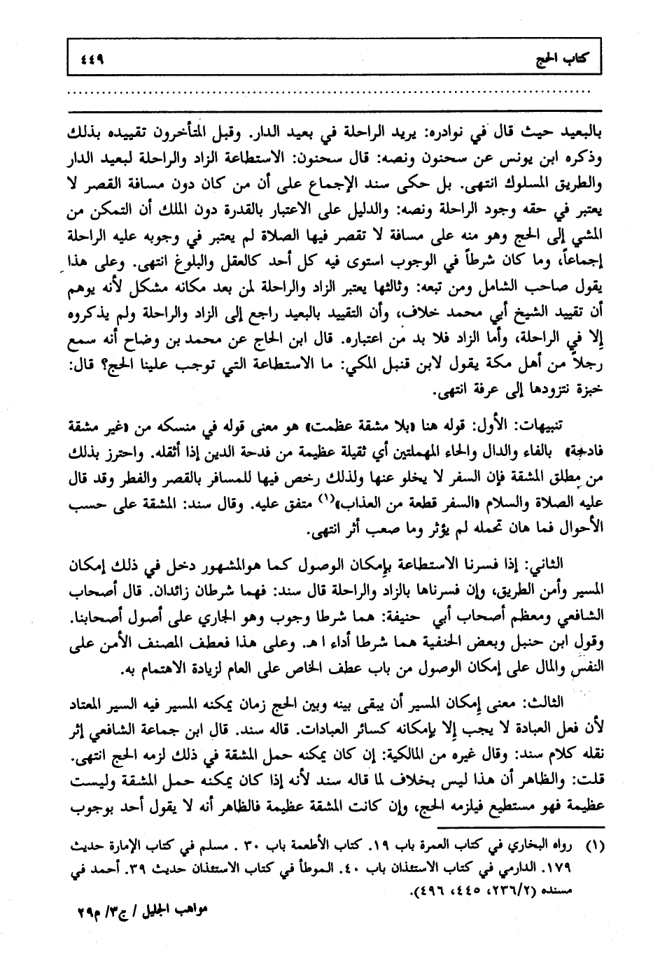 الثالث: معنى إمكان المسير أن يبقى بينه وبين الحج زمان يمكنه المسير فيه السير المعتاد لأن فعل العبادة لا يجب إلا بإمكانه كسائر العبادات قاله سند قال ابن جماعة الشافعي إثر نقله كلام سند وقال غيره من المالكية إن كان يمكنه حمل المشقة في ذلك لزمه الحج انتهى.