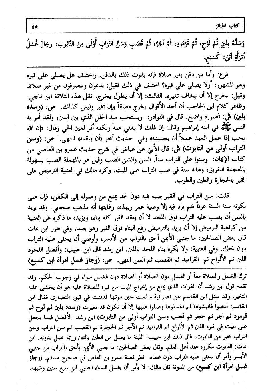 قلت: سن التراب في القبر صبه فيه دون لحد يمنع من وصوله إلى الكفن فإن عنى بكونه سنة السنة عرفا فلم يرد فيه إلا وصية عمر وبهذه وغايتها أنه مذهب صحابي وقد يريد بالسن أن يصب عليه التراب فوق اللحد لا أن يعقد القبر كله بناء ويؤيده ما ذكره عن العتبية من كراهية الترميض إلا أن يريد بالترميض رفع البناء فوق القبر وهو بعيد وفي طرر ابن عات قال بعض الصالحين ما جنبي الأيمن أحق بالتراب من الأيسر وأوصي أن يحثى عليه التراب دون غطاء وفي العتبية ولا يكره بناء اللحد باللبن ابن رشد قال ابن حبيب: وأفضل اللحود اللبن عند ال ألواح عند ال قراميد عند ال قصب عند ال سن انتهى. ص: "وجاز غسل امرأة ابن كسبع"
