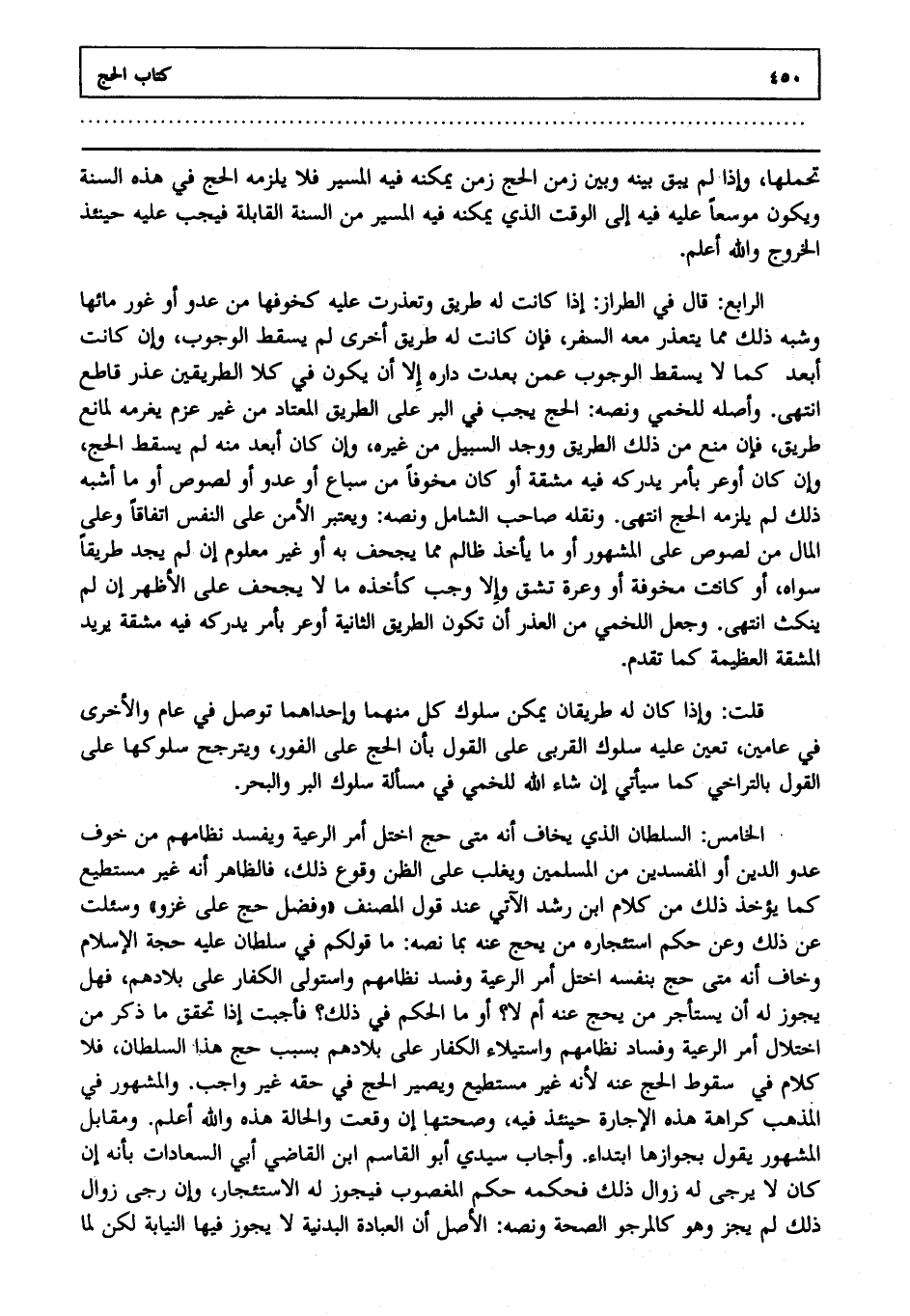 الخامس: السلطان الذي يخاف أنه متى حج اختل أمر الرعية ويفسد نظامهم من خوف عدو الدين أو المفسدين من المسلمين ويغلب على الظن وقوع ذلك فالظاهر أنه غير مستطيع كما يؤخذ ذلك من كلام ابن رشد الآتي عند قول المصنف وفضل حج على غزو وسئلت عن ذلك وعن حكم استئجاره من يحج عنه بما نصه ما قولكم في سلطان عليه حجة الإسلام وخاف أنه متى حج بنفسه اختل أمر الرعية وفسد نظامهم واستولى الكفار على بلادهم فهل يجوز له أن يستأجر من يحج عنه أم لا أو ما الحكم في ذلك فأجبت إذا تحقق ما ذكر من اختلال أمر الرعية وفساد نظامهم واستيلاء الكفار على بلادهم بسبب حج هذا السلطان فلا كلام في سقوط الحج عنه لأنه غير مستطيع ويصيرالحج في حقه غير واجب والمشهور في المذهب كراهة هذه الإجارة حينئذ فيه وصحتها إن وقعت والحالة هذه والله أعلم. ومقابل المشهور يقول بجوازها ابتداء وأجاب سيدي أبو القاسم ابن القاضي أبي السعادات بأنه إن كان لا يرجى له زوال ذلك فحكمه حكم المغصوب فيجوز له الاستئجار وإن رجى زوال ذلك لم يجز وهو كالمرجو الصحة ونصه الأصل أن العبادة البدنية لا يجوز فيها النيابة لكن لما