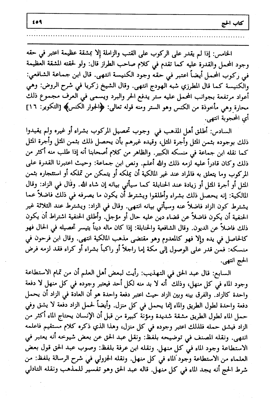 السابع: قال عبد الحق في التهذيب: رأيت لبعض أهل العلم أن من تمام الاستطاعة وجود الماء في كل منهل وذلك أنه لا بد منه لكل أحد فيعتبر وجوده في كل منهل لا دفعة واحدة كالزاد والفرق بينه وبين الزاد حيث اعتبر دفعة واحدة هو أن العادة في الزاد أن يحمل دفعة واحدة لطول الطريق والماء إنما يحمل في كل منزل وأيضا لحمل الزاد دفعة لا يشق وفي حمل الماء لطول الطريق مشقة شديدة ومؤنة كبيرة من قبل أن الإنسان يحتاج الماء أكثر من الزاد فيشق حمله فلذلك اعتبر وجوده في كل منزل وهذا الذي ذكره كلام مستقيم فاعلمه انتهى. ونقله المصنف في توضيحه بلفظ ونقل عبد الحق عن بعض شيوخه أنه يعتبر في الاستطاعة وجود الماء في كل منهل ونقله ابن عرفة بلفظ وصوب عبد الحق قول بعض العلماء من الاستطاعة وجود الماء في كل منهل ونقله الجزولي في شرح الرسالة بلفظ من شرط الحج أنه يجد الماء في كل منهل قاله عبد الحق وهو تفسير للمذهب ونقله التادلي