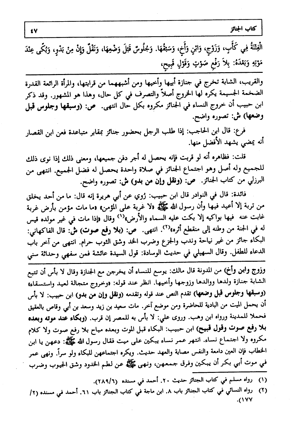 والفتنة في كأب وزوج وابن وأخ وسبقها وجلوس قبل وضعها ونقل وإن من بدو ، وبكى عند موته وبعده بلا رفع صوت وقول قبيح.