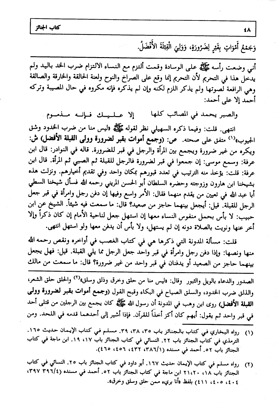 انتهى. قلت: وفيما ذكره السهيلي نظر لقوله صلى الله عليه وسلم: "ليس منا من ضرب الخدود وشق الجيوب" 1 متفق على صحته. ص: "وجمع أموات بقبر لضرورة وولى القبلة الأفضل". ش: ويكره من غير ضرورة ويجمع بين المرأة والرجل في قبر للضرورة قاله في النوادر قال ابن عرفة: وسمع موسى إن جمعوا في قبر لضرورة فالرجل للقبلة عند ال صبي عند ال مرأة قال ابن عرفة: قلت: يؤخذ منه الترتيب في تعدد قبورهم بمكان واحد وفي تقديم أخيارهم ونزلت هذه بشيخنا ابن هارون وزوجته وحضره السلطان أبو الحسن المريني رحمه الله فسأل شيخنا السطي أبا عبد الله في تعيين من يقدم منهما فقال الأمر واسع وفيها إن دفن رجل وامرأة في قبر جعل الرجل للقبلة قيل أيجعل بينهما حاجز من صعيد قال ما سمعت فيه شيئا الشيخ عن ابن حبيب لا بأس بحمل منفوس النساء معها إن استهل جعل لناحية الأمام إن كان ذكرا وإلا أخر عنها ونويت بالصلاة دونه إن لم يستهل ولا بأس أن يدفن معها ولو استهل انتهى.