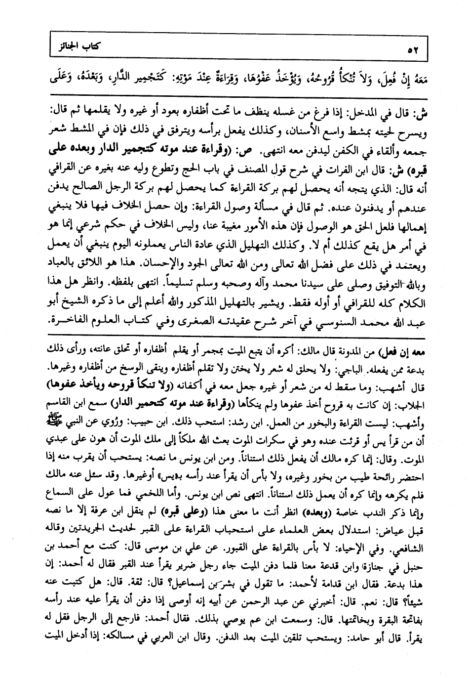 ش قال في المدخل إذا فرغ من غسله ينظف ما تحت أظفاره بعود أو غيره ولا يقلمها ثم قال ويسرح لحيته بمشط واسع الأسنان وكذلك يفعل برأسه ويترفق في ذلك فإن في المشط شعر جمعه وألقاه في الكفن ليدفن معه انتهى. ص: "وقراءة عند موته كتجمير الدار وبعده على قبره". ش: قال ابن الفرات في شرح قول المصنف في باب الحج وتطوع وليه عنه بغيره عن القرافي أنه قال الذي يتجه أنه يحصل لهم بركة القراءة كما يحصل لهم بركة الرجل الصالح يدفن عندهم أو يدفنون عنده ثم قال في مسألة وصول القراءة وإن حصل الخلاف فيها فلا ينبغي إهمالها فلعل الحق هو الوصول فإن هذه الأمور مغيبة عنا وليس الخلاف في حكم شرعي إنما هو في أمر هل يقع كذلك أم لا وكذلك التهليل الذي عادة الناس يعملونه اليوم ينبغي أن يعمل ويعتمد في ذلك على فضل الله تعالى ومن الله تعالى الجود والإحسان هذا هو اللائق بالعباد وبالله التوفيق وصلى على سيدنا محمد وآله وصحبه وسلم تسليما انتهى. بلفظه وانظر هل هذا الكلام كله للقرافي أو أوله فقط ويشير بالتهليل المذكور والله أعلم. إلى ما ذكره الشيخ أبو عبد الله محمد السنوسي في آخر شرح عقيدته الصغرى وفي كتاب العلوم الفاخرة