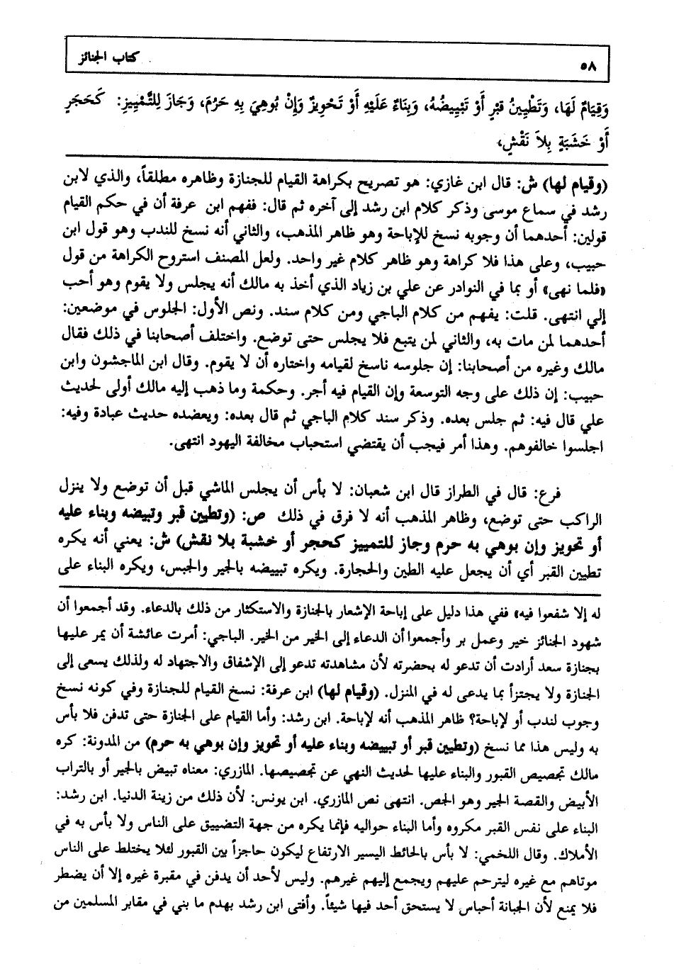 فرع: قال في الطراز: قال ابن شعبان: لا بأس أن يجلس الماشي قبل أن توضع ولا ينزل الراكب حتى توضع وظاهر المذهب أنه لا فرق في ذلك. ص: "وتطيين قبر وتبيضه وبناء عليه أو تحويز وإن بوهي به حرم وجاز للتمييز كحجر أو خشبة بلا نقش". ش: يعني أنه يكره تطيين القبر أي أن يجعل عليه الطين والحجارة ويكره تبييضه بالجير والجبس ويكره البناء على