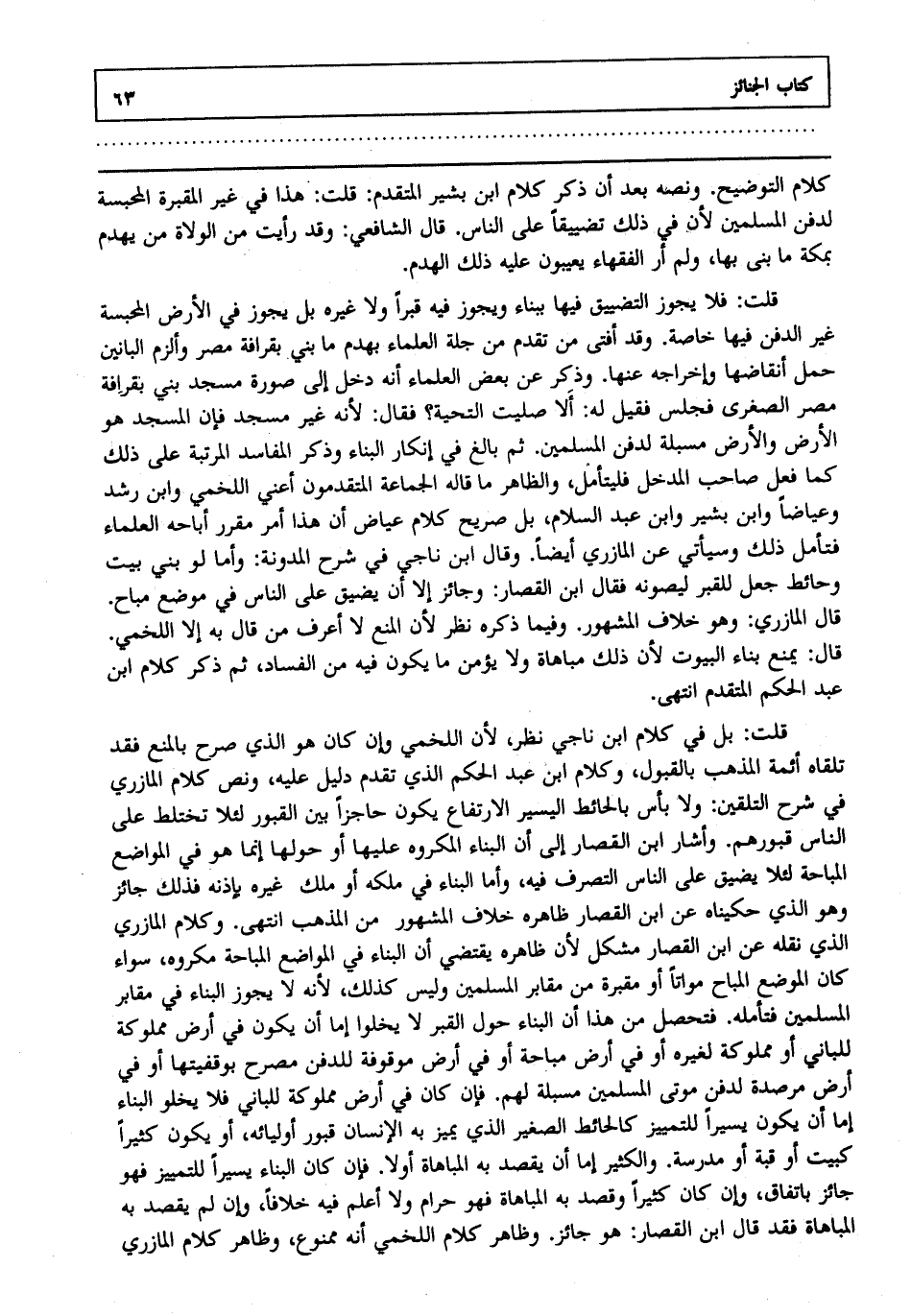 كلام التوضيح ونصه بعد أن ذكر كلام ابن بشير المتقدم قلت: هذا في غير المقبرة المحبسة لدفن المسلمين لأن في ذلك تضييقا على الناس قال الشافعي: وقد رأيت من الولاة من يهدم بمكة ما بنى بها ولم أر الفقهاء يعيبون عليه ذلك الهدم.