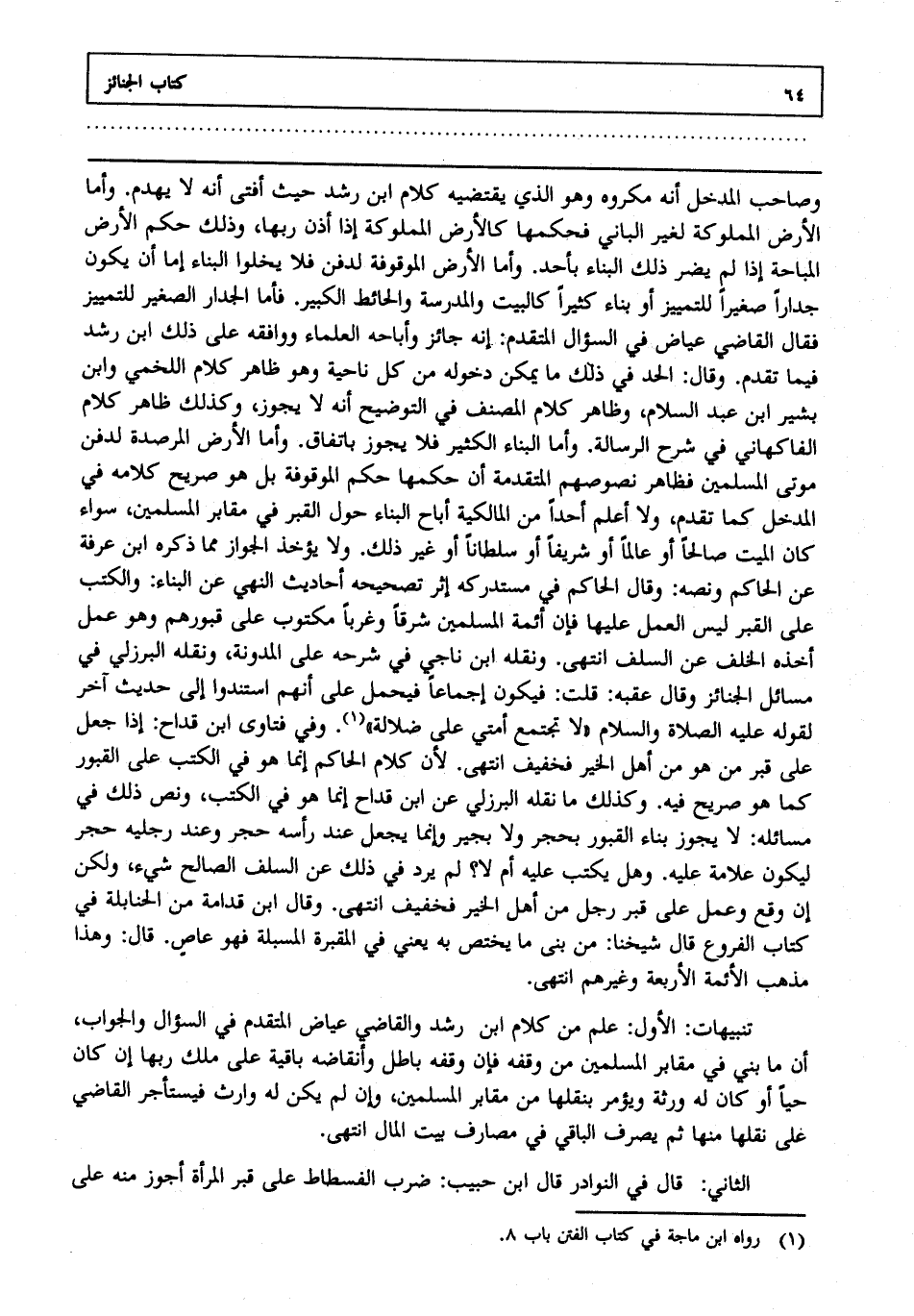 وصاحب المدخل أنه مكروه وهو الذي يقتضيه كلام ابن رشد حيث أفتى أنه لا يهدم وأما الأرض المملوكة لغير الباني فحكمها كالأرض المملوكة إذا أذن ربها وذلك حكم الأرض المباحة إذا لم يضر ذلك البناء بأحد وأما الأرض الموقوفة لدفن فلا يخلوا البناء إما أن يكون جدارا صغيرا للتمييز أو بناء كثيرا كالبيت والمدرسة والحائط الكبير فأما الجدار الصغير للتمييز فقال القاضي عياض في السؤال المتقدم إنه جائز وأباحه العلماء ووافقه على ذلك ابن رشد فيما تقدم وقال الحد في ذلك ما يمكن دخوله من كل ناحية وهو ظاهر كلام اللخمي وابن بشير وابن عبد السلام وظاهر كلام المصنف في التوضيح أنه لا يجوز وكذلك ظاهر كلام الفاكهاني في شرح الرسالة وأما البناء الكثير فلا يجوز باتفاق وأما الأرض المرصدة لدفن موتى المسلمين فظاهر أن حكمها حكم الموقوفة بل هو صريح كلامه في المدخل كما تقدم ولا أعلم أحدا من المالكية أباح البناء حول القبر في مقابر المسلمين سواء كان الميت صالحا أو عالما أو شريفا أو سلطانا أوغير ذلك ولا يؤخذ الجواز مما ذكره ابن عرفة عن الحاكم ونصه وقال الحاكم في مستدركه إثر تصحيحه أحاديث النهي عن البناء والكتب على القبر ليس العمل عليها فإن أئمة المسلمين شرقا وغربا مكتوب على قبورهم وهو عمل أخذه الخلف عن السلف انتهى. ونقله ابن ناجي في شرحه على المدونة ونقله البرزلي في مسائل الجنائز وقال عقبه قلت: فيكون إجماعا فيحمل على أنهم استندوا إلى حديث آخر لقوله عليه الصلاة والسلام: "لا تجتمع أمتي على ضلالة" 1 وفي فتاوى ابن قداح إذا جعل على قبر من هو من أهل الخير فخفيف انتهى. لأن كلام الحاكم إنما هو في الكتب على القبور كما هو صريح فيه وكذلك ما نقله البرزلي عن ابن قداح إنما هو في الكتب ونص ذلك في مسائله لا يجوز بناء القبور بحجر ولا بجير وإنما يجعل عند رأسه حجر وعند رجليه حجر ليكون علامة عليه وهل يكتب عليه أم لا لم يرد في ذلك عن السلف الصالح شيء ولكن إن وقع وعمل على قبر رجل من أهل الخير فخفيف انتهى. وقال ابن قدامة من الحنابلة في كتاب الفروع قال شيخنا من بنى ما يختص به يعني في المقبرة المسبلة فهو عاص قال وهذا مذهب الأئمة الأربعة وغيرهم انتهى.