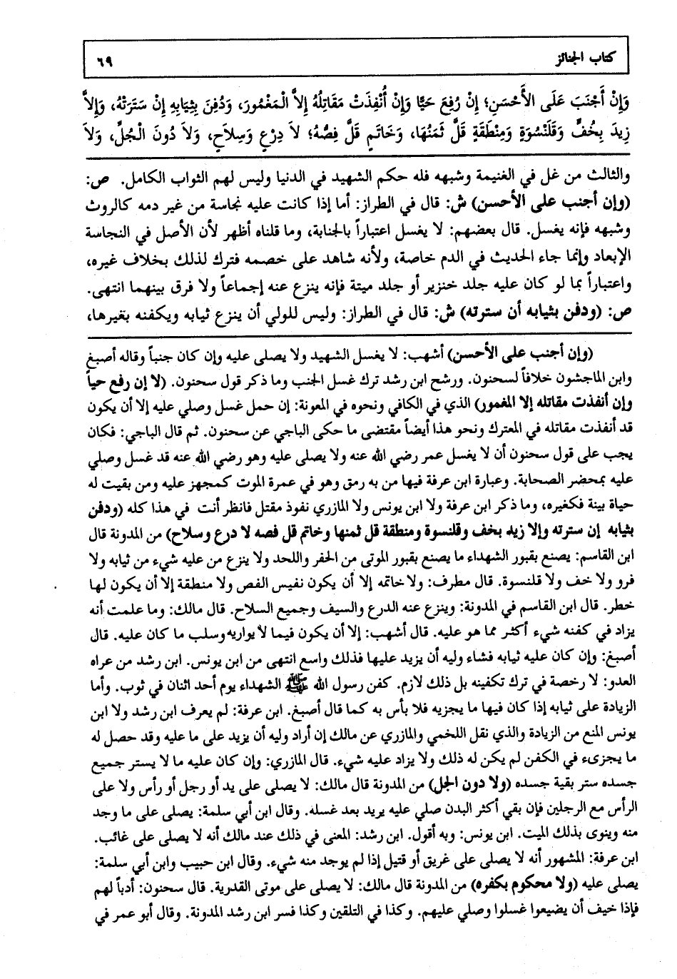 وإن أجنب على الأحسن إن رفع حياً وإن أنفذت مقاتله إلا المغمور ودفن بثيابه إن سترته وإلا زيد بخف وقلنسوة ومنطقة قل ثمنها وخاتم قل فصه لا درع وسلاح ولا دون الجلّ ولا ,