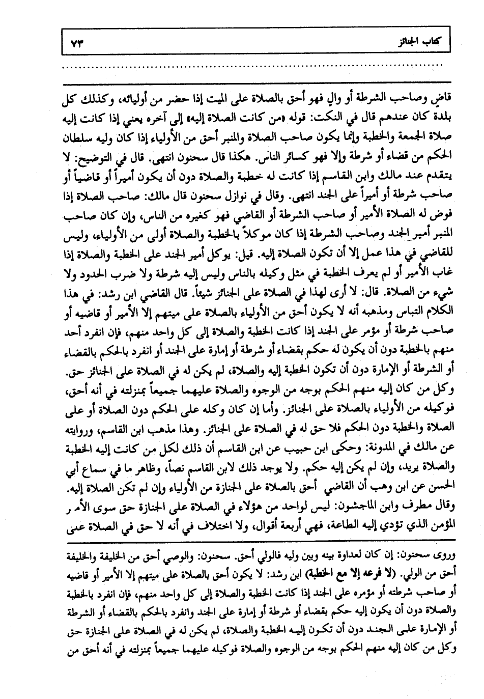 قاض وصاحب الشرطة أو وال فهو أحق بالصلاة على الميت إذا حضر من أوليائه وكذلك كل بلدة كان عندهم قال في النكت: قوله: "من كانت الصلاة إليه إلى آخره" يعني إذا كانت إليه صلاة الجمعة والخطبة وإنما يكون صاحب الصلاة والمنبر أحق من الأولياء إذا كان وليه سلطان الحكم من قضاء أو شرطة وإلا فهو كسائر الناس هكذا قال سحنون انتهى. قال في التوضيح: لا يتقدم عند مالك وابن القاسم إذا كانت له خطبة والصلاة دون أن يكون أميرا أو قاضيا أو صاحب شرطة أو أميرا على الجند انتهى. وقال في نوازل سحنون قال مالك: صاحب الصلاة إذا فوض له الصلاة الأمير أو صاحب الشرطة أو القاضي فهو كغيره من الناس وإن كان صاحب المنبر أمير الجند وصاحب الشرطة إذا كان موكلا بالخطبة والصلاة أولى من الأولياء وليس للقاضي في هذا عمل إلا أن تكون الصلاة إليه قيل يوكل أمير الجند على الخطبة والصلاة إذا غاب الأمير أو لم يعرف الخطبة في مثل وكيله بالناس وليس إليه شرطة ولا ضرب الحدود ولا شيء من الصلاة قال لا أرى لهذا في الصلاة على الجنائز شيئا قال القاضي ابن رشد في هذا الكلام التباس ومذهبه أنه لا يكون أحق من الأولياء بالصلاة على ميتهم إلا الأمير أو قاضيه أو صاحب شرطة أو مؤمر على الجند إذا كانت الخطبة والصلاة إلى كل واحد منهم فإن انفرد أحد منهم بالخطبة دون أن يكون له حكم بقضاء أو شرطة أو إمارة على الجند أو انفرد بالحكم بالقضاء أو الشرطة أو الإمارة دون أن تكون الخطبة إليه والصلاة لم يكن له في الصلاة على الجنائز حق وكل من كان إليه منهم الحكم بوجه من الوجوه والصلاة عليهما جميعا بمنزلته في أنه أحق فوكيله من الأولياء بالصلاة على الجنائز وأما إن كان وكله على الحكم دون الصلاة أو على الصلاة والخطبة دون الحكم فلا حق له في الصلاة على الجنائز وهذا مذهب ابن القاسم وروايته عن مالك في المدونة وحكى ابن حبيب عن ابن القاسم أن ذلك لكل من كانت إليه الخطبة والصلاة يريد وإن لم يكن إليه حكم ولا يوجد ذلك لابن القاسم نصا وظاهر ما في سماع أبي الحسن عن ابن وهب أن القاضي أحق بالصلاة على الجنازة من الأولياء وإن لم تكن الصلاة إليه وقال مطرف وابن الماجشون ليس لواحد من هؤلاء في الصلاة على الجنازة حق سوى الأمير المؤمن الذي تؤدي إليه الطاعة فهي أربعة أقوال ولا اختلاف في أنه لا حق في الصلاة على