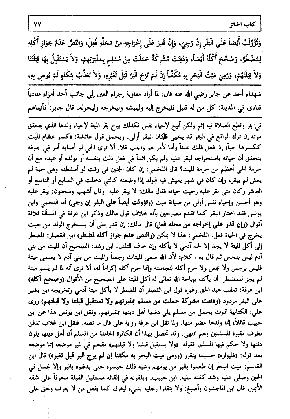وتؤولت أيضاً على البقر إن رجي وإن قدر على إخراجه من محله فعل والنص عدم جواز أكله لمضطر وصحح أكله أيضاً ودفنت مشركة حملت من مسلم بمقبرتهم لا يستقبل بها قبلتنا ولا قبلتهم ورمي ميت البحر به مكفناً إن لم يرج البر قبل تغيره ولا يعذب ببكاء لم يوص به ،