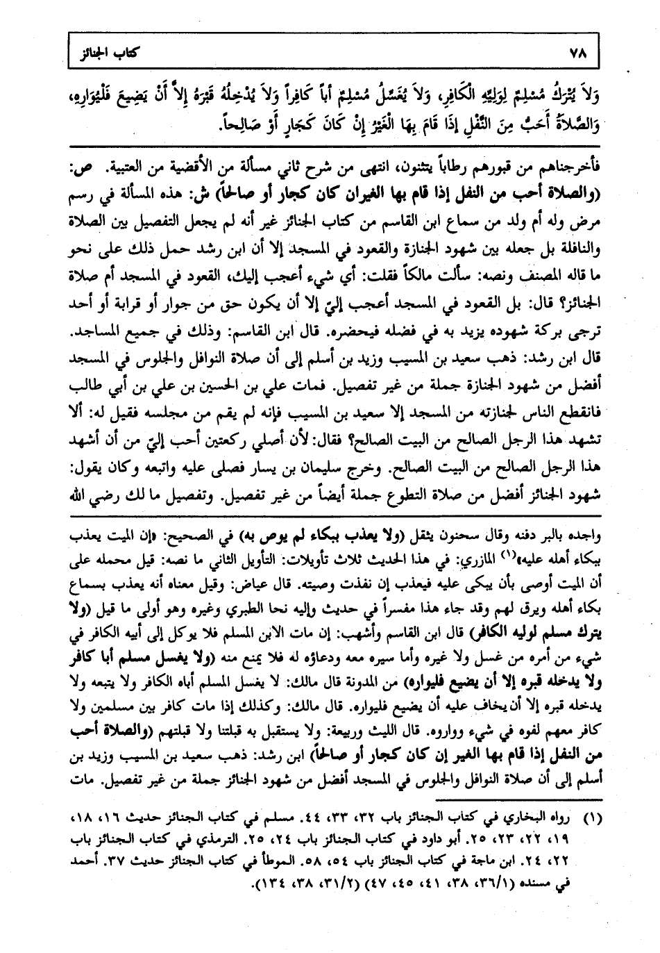 فأخرجناهم من قبورهم رطابا يتثنون انتهى. من شرح ثاني مسألة من الأقضية من العتبية. ص: "والصلاة أحب من النفل إذا قام بها الغيران كان كجار أو صالحا". ش: هذه المسألة في رسم مرض وله أم ولد من سماع ابن القاسم من كتاب الجنائز غير أنه لم يجعل التفصيل بين الصلاة والنافلة بل جعله بين شهود الجنازة والقعود في المسجد إلا أن ابن رشد حمل ذلك على نحو ما قاله المصنف ونصه سألت مالكا فقلت أي شيء أعجب إليك القعود في المسجد أم صلاة الجنائز قال بل القعود في المسجد أعجب إلي إلا أن يكون حق من جوار أو قرابة أو أحد ترجى بركة شهوده يزيد به في فضله فيحضره قال ابن القاسم: وذلك في جميع المساجد قال ابن رشد: ذهب سعيد بن المسيب وزيد بن أسلم إلى أن صلاة النوافل والجلوس في المسجد أفضل من شهود الجنازة جملة من غير تفصيل فمات علي بن الحسين بن علي بن أبي طالب فانقطع الناس لجنازته من المسجد إلا سعيد بن المسيب فإنه لم يقم من مجلسه فقيل له ألا تشهد هذا الرجل الصالح من البيت الصالح فقال لأن أصلي ركعتين أحب إلي من أن أشهد هذا الرجل الصالح من البيت الصالح وخرج سليمان بن يسار فصلى عليه واتبعه وكان يقول شهود الجنائز أفضل من صلاة التطوع جملة أيضا من غير تفصيل وتفصيل مالك رضي الله