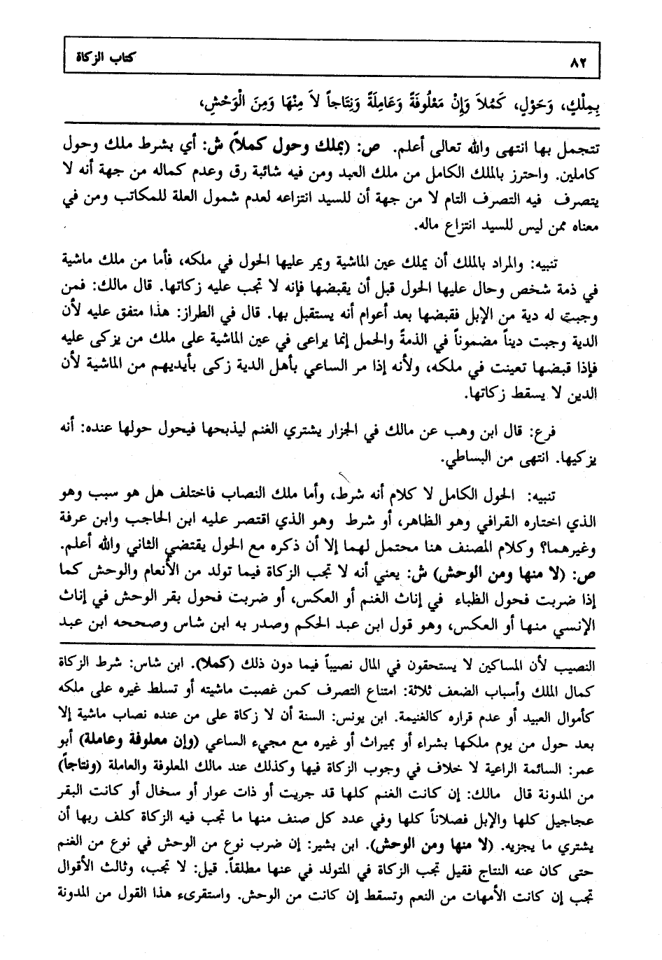 تنبيه: الحول الكامل لا كلام أنه شرط وأما ملك النصاب فاختلف هل هو سبب وهو الذي اختاره القرافي وهو الظاهر أو شرط وهو الذي اقتصر عليه ابن الحاجب وابن عرفة وغيرهما وكلام المصنف هنا محتمل لهما إلا أن ذكره مع الحول يقتضي الثاني والله أعلم. ص: "لا منها ومن الوحش". ش: يعني أنه لا تجب الزكاة فيما تولد من الأنعام والوحش كما إذا ضربت فحول الظباء في إناث الغنم أو العكس أو ضربت فحول بقر الوحش في إناث الإنسي منها أو العكس وهو قول ابن عبد الحكم وصدر به ابن شاس وصححه ابن عبد