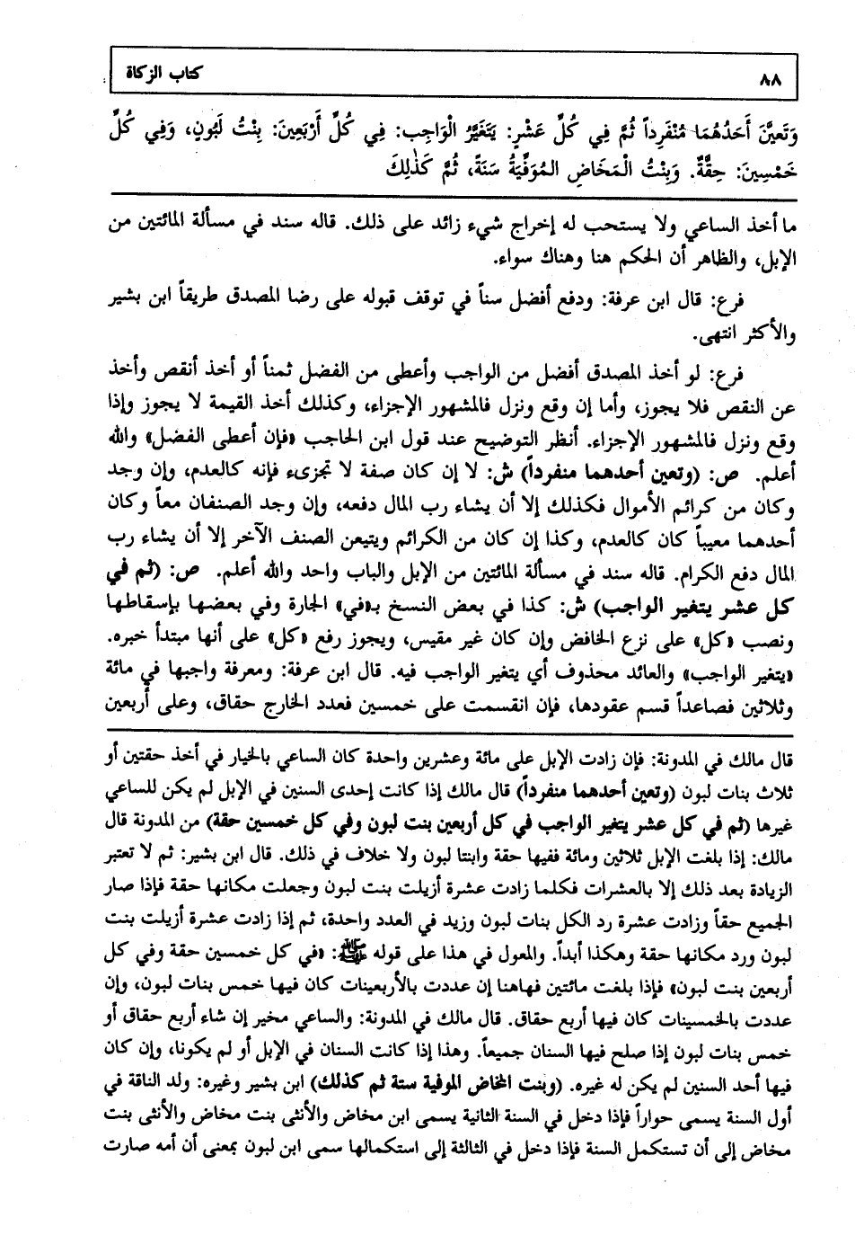 فرع: قال ابن عرفة: ودفع أفضل سنا في توقف قبوله على رضا المصدق طريقا ابن بشير والأكثر انتهى. فرع: لو أخذ المصدق أفضل من الواجب وأعطى من الفضل ثمنا أو أخذ أنقص وأخذ عن النقص فلا يجوز وأما إن وقع ونزل فالمشهور الإجزاء وكذلك أخذ القيمة لا يجوز وإذا وقع ونزل فالمشهور الإجزاء أنظر التوضيح ثم قول ابن الحاجب فإن أعطى الفضل والله أعلم. ص: "وتعين أحدهما منفردا". ش: لا إن كان صفة لاتجزئ فإنه كالعدم وإن وجد وكان من كرائم الأموال فكذلك إلا أن يشاء رب المال دفعه وإن وجد الصنفان معا وكان أحدهما معيبا كان كالعدم وكذا إن كان من الكرائم ويتعين الصنف الآخر إلا أن يشاء رب المال دفع الكرام قاله سند في مسألة المائتين من الإبل والباب واحد والله أعلم. ص: "ثم في كل عشر يتغير الواجب". ش: كذا في بعض النسخ بفي الجارة وفي بعضها بإسقاطها ونصب كل على نزع الخافض وإن كان غير مقيس ويجوز رفع كل على أنها مبتدأ خبره يتغير الواجب والعائد محذوف أي يتغير الواجب فيه قال ابن عرفة: ومعرفة واجبها في مائة وثلاثين فصاعدا قسم عقودها فإن انقسمت على خمسين فعدد الخارج حقاق وعلى أربعين