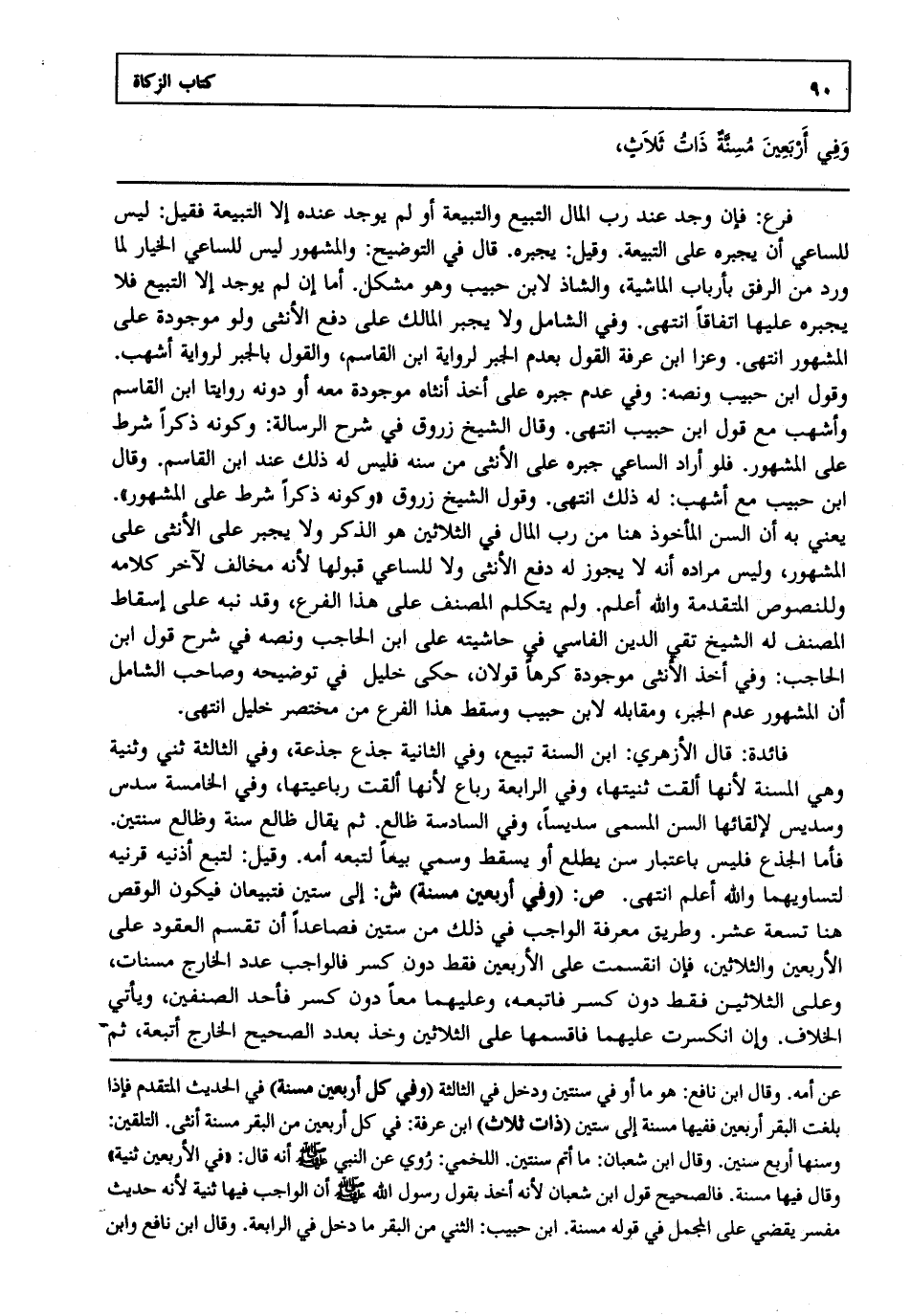 فائدة: قال الأزهري ابن السنة تبيع وفي الثانية جذع جذعة وفي الثالثة ثني وثنية وهي المسنة لأنها ألقت ثنيتها وفي الرابعة رباع لأنها ألقت رباعيتها وفي الخامسة سدس وسديس لإلقائها السن المسمى سديسا وفي السادسة ظالع ثم يقال ظالع سنة وظالع سنتين فأما الجذع فليس باعتبار سن يطلع أو يسقط وسمي تبيعا لتبعه أمه وقيل لتبع أذنيه قرنيه لتساويهما والله أعلم. انتهى. ص: "وفي أربعين مسنة". ش: إلى ستين فتبيعان فيكون الوقص هنا تسعة عشر وطريق معرفة الواجب في ذلك من ستين فصاعدا أن تقسم العقود على الأربعين والثلاثين فإن انقسمت على الأربعين فقط دون كسر فالواجب عدد الخارج مسنات وعلى الثلاثين فقط دون كسر فاتبعه وعليهما معا دون كسر فأحد الصنفين ويأتي الخلاف وإن انكسرت عليهما فاقسمها على الثلاثين وخذ بعدد الصحيح الخارج أتبعة ثم