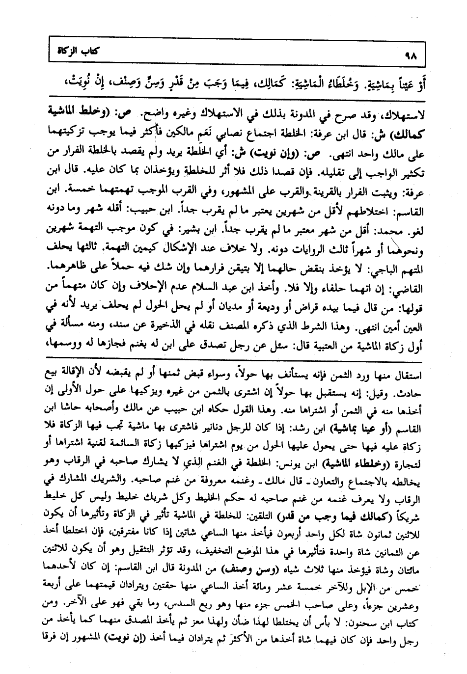 لاستهلاك وقد صرح في المدونة بذلك في الاستهلاك وغيره واضح. ص: "وخلط الماشية كمالك". ش: قال ابن عرفة: الخلطة اجتماع نصابي نعم مالكين فأكثر فيما يوجب تزكيتهما على مالك واحد انتهى. ص: "وإن نويت". ش: أي الخلطة يريد ولم يقصد بالخلطة الفرار من تكثير الواجب إلى تقليله فإن قصدا ذلك فلا أثر للخلطة ويؤخذان بما كان عليه قال ابن عرفة: ويثبت الفرار بالقرينة والقرب على المشهور وفي القرب الموجب تهمتهما خمسة ابن القاسم اختلاطهم لأقل من شهرين يعتبر ما لم يقرب جدا ابن حبيب أقله شهر وما دونه لغو محمد أقل من شهر معتبر ما لم يقرب جدا ابن بشير في كون موجب التهمة شهرين ونحوهما أو شهرا ثالث الروايات دونه ولا خلاف عند الإشكال كيمين التهمة ثالثها يحلف المتهم الباجي لا يؤخذ بنقض حالهما إلا بتيقن فرارهما وإن شك فيه حملا على ظاهرهما القاضي إن اتهما حلفا وإلا فلا وأخذ ابن عبد السلام عدم الإحلاف وإن كان متهما من قولها من قال فيما بيده قراض أو وديعة أو مديان أو لم يحل الحول لم يحلف يريد لأنه في العين أمين انتهى. وهذا الشرط الذي ذكره المصنف نقله في الذخيرة عن سند ومنه مسألة في أول زكاة الماشية من العتبية قال سئل عن رجل تصدق على ابن له بغنم فجازها له ووسمها