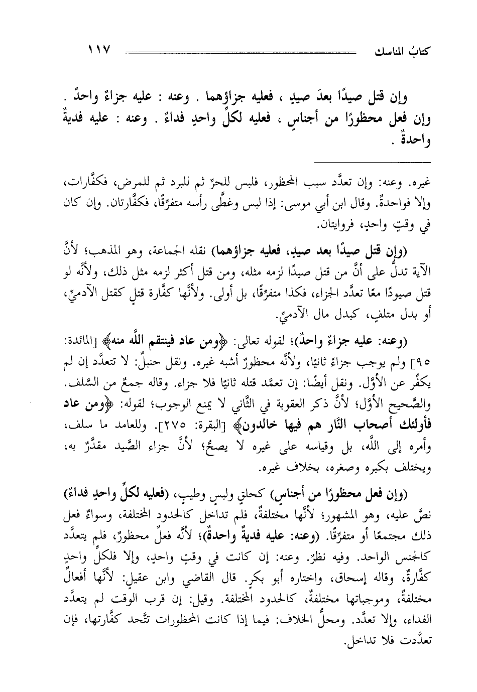 "وعنه: عليه جزاء واحد" لقوله تعالى: {وَمَنْ عَادَ فَيَنْتَقِمُ اللَّهُ مِنْهُ} [المائدة: 95] ولم يوجب جزاء ثانيا ولأنه محظور أشبه غيره ونقل حنبل لا تتعدد إن لم يكفر عن الأول ونقل أيضا إن تعمد قتله ثانيا فلا جزاء وقاله جمع من السلف والصحيح الأول لأن ذكر العقوبة في الثاني لا يمنع الوجوب لقوله: {وَمَنْ عَادَ فَأُولَئِكَ أَصْحَابُ النَّارِ هُمْ فِيهَا خَالِدُونَ} [البقرة: 275] وللعامد ما سلف وأمره إلى الله بل وقياسه على غيره لا يصح لأن جزاء الصيد مقدر به ويختلف بكبره وصغره بخلاف غيره.