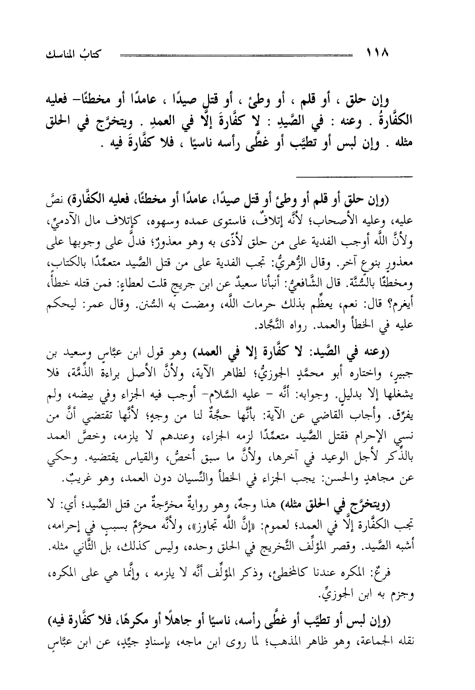 "وعنه في الصيد: لا كفارة إلا في العمد" وهو قول ابن عباس وسعيد بن جبير واختاره أبو محمد الجوزي لظاهر الآية ولأن الأصل براءة الذمة فلا يشغلها إلا بدليل وجوابه أنه عليه السلام أوجب فيه الجزاء وفي بيضه ولم يفرق وأجاب القاضي عن الآية بأنها حجة لنا من وجه لأنها تقتضي أن من نسي الإحرام فقتل الصيد متعمدا لزمه الجزاء وعندهم لا يلزمه وخص العمد بالذكر لأجل الوعيد في آخرها ولأن ما سبق أخص والقياس يقتضيه وحكي عن مجاهد والحسن يجب الجزاء في الخطأ والنسيان دون العمد وهو غريب
