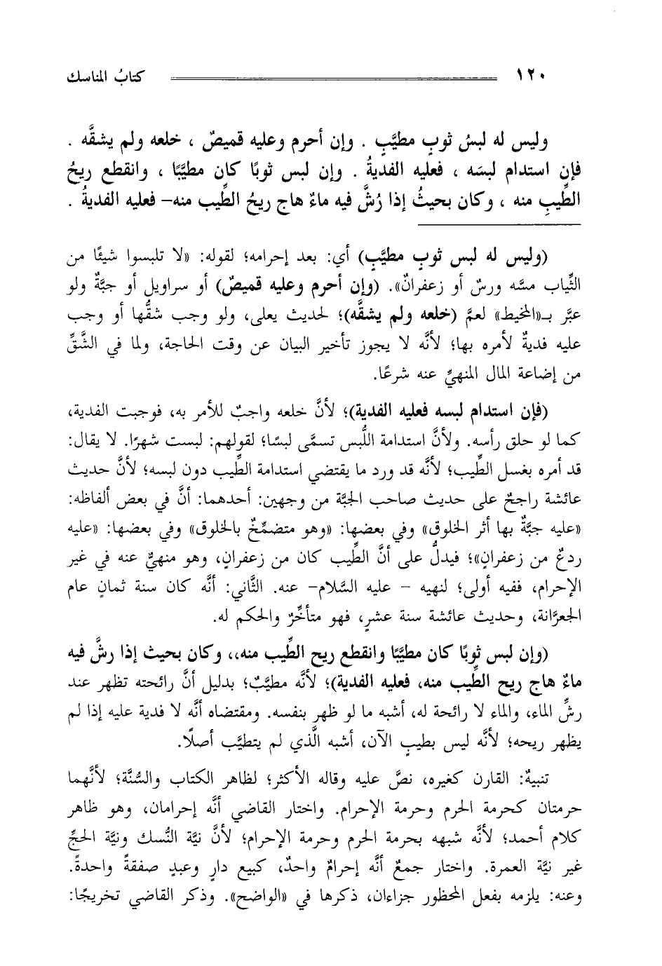 "وليس له لبس ثوب مطيب" أي: بعد إحرامه لقوله: "لا تلبسوا شيئا من الثياب مسه ورس أو زعفران". "وإن أحرم وعليه قميص" أو سراويل أوجبة ولو عبر بـ"المخيط" لعم "خلعه ولم يشقه" لحديث يعلى ولو وجب شقها أو وجب عليه فدية لأمره بها لأنه لا يجوز تأخير البيان عن وقت الحاجة ولما في الشق من إضاعة المال المنهي عنه شرعا.
