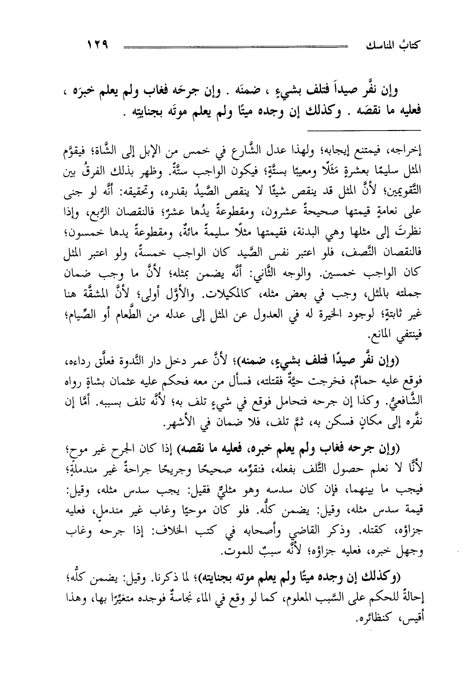 وإن نفر صيدا فتلف بشيء ضمنه وإن جرحه فغاب ولم يعلم خبره فعليه ما نقصه وكذلك إن وجده ميتا ولم يعلم موته بجنايته.