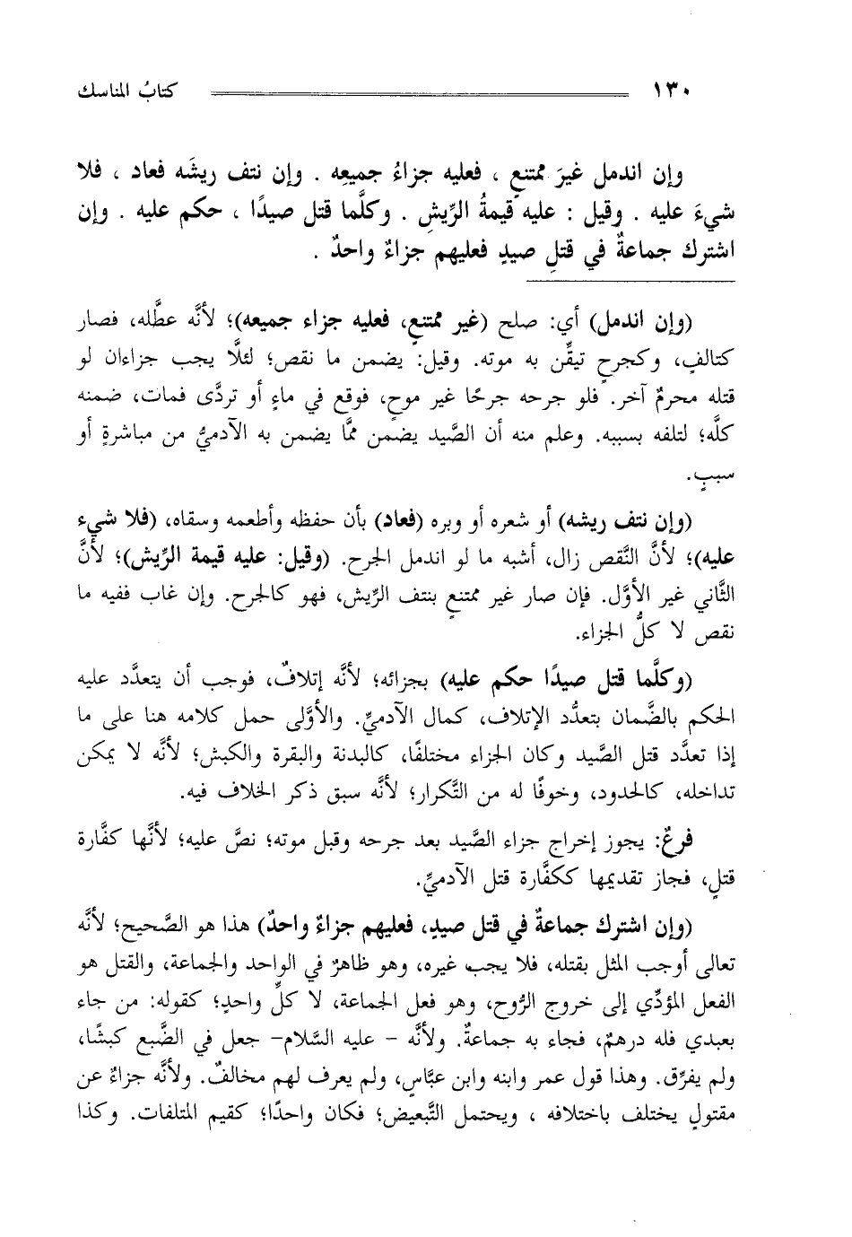 "وإن اشترك جماعة في قتل صيد فعليهم جزاء واحد" هذا هو الصحيح لأنه تعالى أوجب المثل بقتله فلا يجب غيره وهو ظاهر في الواحد والجماعة والقتل هو الفعل المؤدي إلى خروج الروح وهو فعل الجماعة لا كل واحد كقوله من جاء بعبدي فله درهم فجاء به جماعة ولأنه عليه السلام جعل في الضبع كبشا ولم يفرق وهذا قول عمر وابنه وابن عباس ولم يعرف لهم مخالف ولأنه جزاء عن مقتول يختلف باختلافه ويحتمل التبعيض فكان واحدا كقيم المتلفات. وكذا