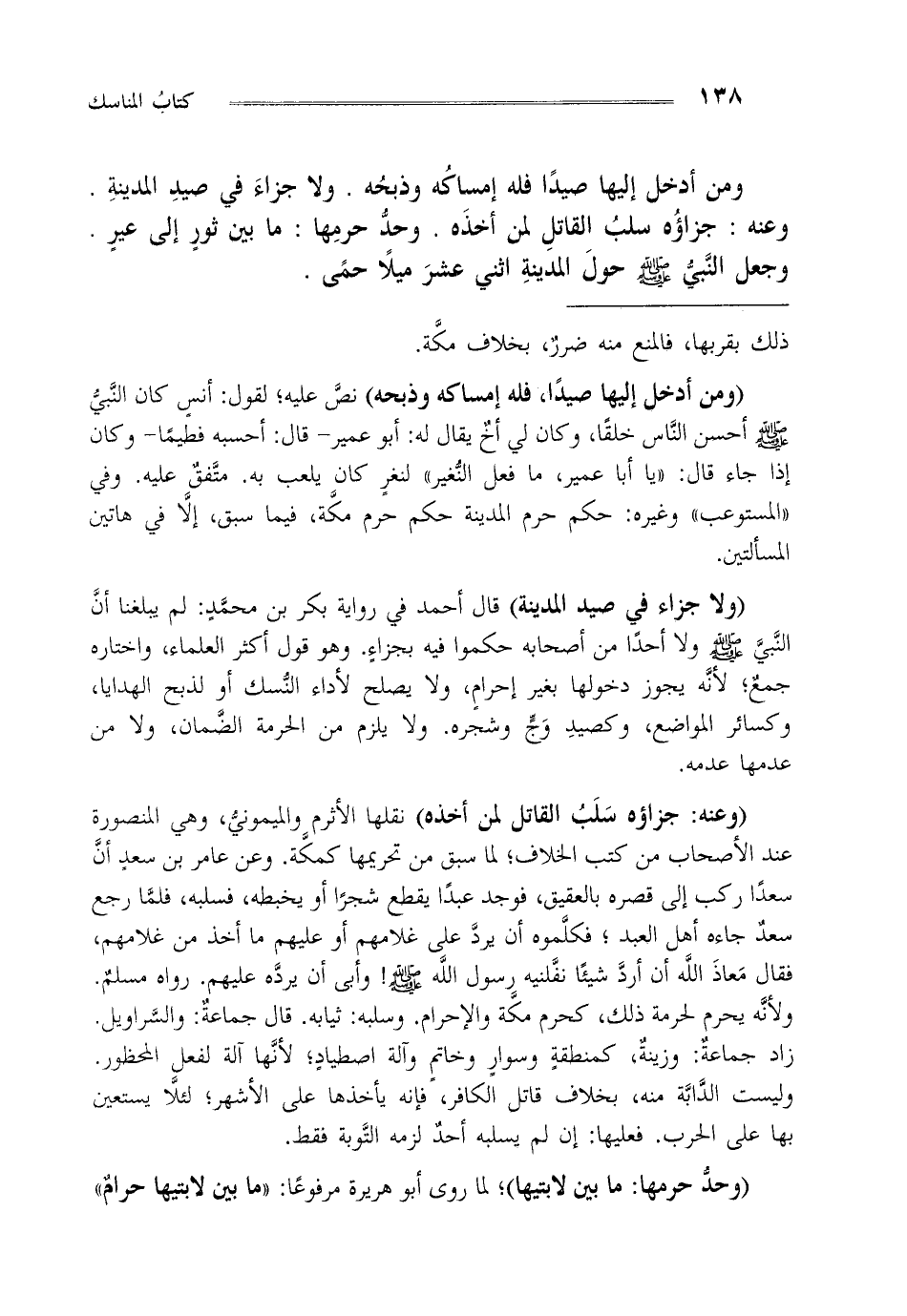 "وعنه: جزاؤه سلب القاتل لمن أخذه" نقلها الأثرم والميموني وهي المنصورة عند الأصحاب من كتب الخلاف لما سبق من تحريمها كمكة وعن عامر بن سعد أن سعدا ركب إلى قصره بالعقيق فوجد عبدا يقطع شجرا أو يخبطه فسلبه فلما رجع سعد جاءه أهل العبد فكلموه أن يرد على غلامهم أو عليهم ما أخذ من غلامهم فقال معاذ الله أن أرد شيئا نفلنيه رسول الله صلى الله عليه وسلم وأبى أن يرده عليهم رواه مسلم ولأنه يحرم لحرمة ذلك كحرم مكة و الإحرام وسلبه ثيابه قال جماعة والسراويل زاد جماعة وزينة كمنطقة وسوار وخاتم وآلة اصطياد لأنها آلة لفعل المحظور وليست الدابة منه بخلاف قاتل الكافر فإنه يأخذها على الأشهر لئلا يستعين بها على الحرب فعليها إن لم يسلبه أحد لزمه التوبة فقط.