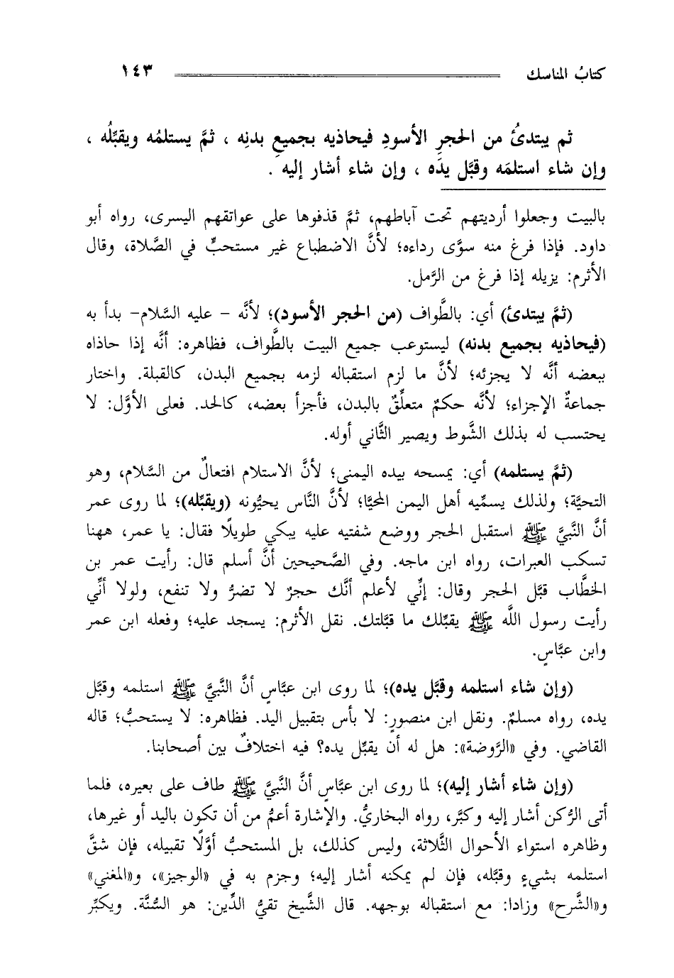 "ثم يستلمه" أي: يمسحه بيده اليمنى لأن الاستلام افتعال من السلام وهو التحية ولذلك يسميه أهل اليمن المحيا لأن الناس يحيونه "ويقبله" لما روى عمر أن النبي صلى الله عليه وسلم استقبل الحجر ووضع شفتيه عليه يبكي طويلا فقال يا عمر ها هنا تسكب العبرات رواه ابن ماجه وفي الصحيحين أن أسلم قال رأيت عمر بن الخطاب قبل الحجر وقال إني لأعلم أنك حجر لا تضر ولا تنفع ولولا أني رأيت رسول الله صلى الله عليه وسلم يقبلك ما قبلتك نقل الأثرم يسجد عليه وفعله ابن عمر وابن عباس.