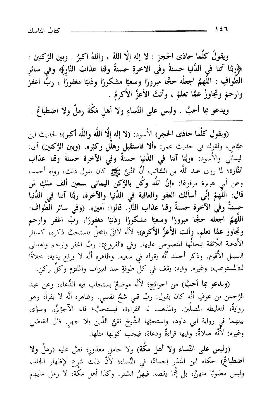 "ويقول كلما حاذى الحجر" الأسود: "لا إله إلا الله والله أكبر" لحديث بن عباس ولقوله في حديث عمر: "ألا فاستقبل وهلل وكبر". "وبين الركنين" أي: اليماني والأسود: {رَبَّنَا آتِنَا فِي الدُّنْيَا حَسَنَةً وَفِي الْآخِرَةِ حَسَنَةً وَقِنَا عَذَابَ النَّارِ} لما روى عبد الله بن السائب أن النبي صلى الله عليه وسلم كان يقول ذلك رواه أحمد وعن أبي هريرة مرفوعا: "إن الله وكل بالركن اليماني سبعين ألف ملك لمن قال اللهم إني أسألك العفو والعافية في الدنيا والآخرة ربنا آتنا في الدنيا حسنة وفي الآخرة حسنة وقنا عذاب النار قالوا: آمين". "وفي سائر الطواف اللهم اجعله حجا مبرورا وسعيا مشكورا وذنبا مغفورا رب اغفر وارحم و تجاوز عما تعلم وأنت الأعز الأكرم"، لأنه لائق بالمحل فاستحب ذكره كسائر الأدعية اللائقة بمحالها المنصوص عليها وفي "الفروع": رب اغفر وارحم واهدني السبيل الأقوم وذكر أحمد أنه يقوله في سعيه وظاهره أنه لا يرفع يديه خلافا لـ"المستوعب" وغيره. وفيه: يقف في كل طوفة عند الميزاب والملتزم وكل ركن.