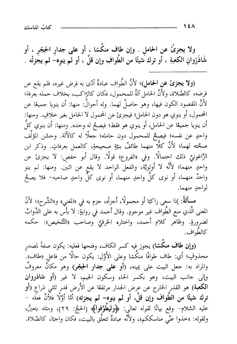 "وإن طاف منكسا" يجوز فيه كسر الكاف وفتحها فعليه يكون صفة لمصدر محذوف أي طاف طوافا منكسا وعلى الأول يكون حالا من فاعل "طاف" والمراد به جعل البيت على يمينه، "أو على جدار الحجر" وهو مكان معروف وإلى جانب البيت وهو بكسر الحاء وسكون الجيم لا غير "أو شاذروان الكعبة" هو القدر الخارج عن عرض الجدار مرتفعا عن الأرض قدر ثلثي ذراع "أو ترك شيئا من الطواف وإن قل أو لم ينوه لم يجزئه" أما أولا فلأن فعله عليه السلام وقع بيانا لقوله تعالى: {وَلْيَطَّوَّفُوا} [الحج: 29]، الحج ومثله يتعين ولقوله: "خذوا عني مناسككم" ، ولأنه عبادة تتعلق بالبيت فكان واجبا كالصلاة