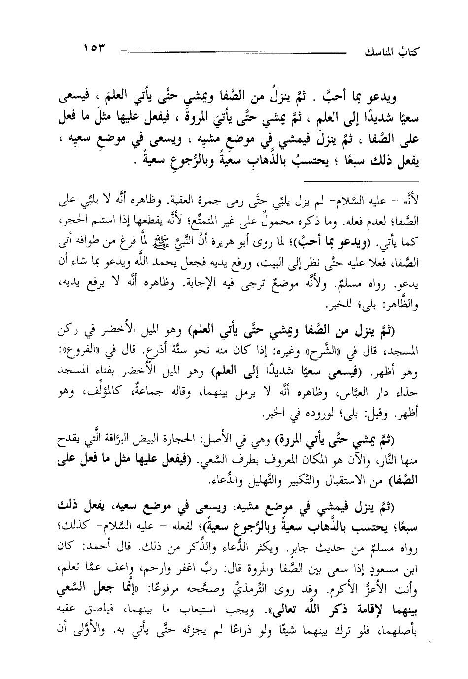 "ثم ينزل من الصفا ويمشي حتى يأتي العلم" وهو الميل الأخضر في ركن المسجد قال في "الشرح" وغيره: إذا كان منه نحو ستة أذرع قال في "الفروع": وهو أظهر. "فيسعى سعيا شديدا إلى العلم" وهو الميل الأخضر بفناء المسجد حذاء دار العباس وظاهره أنه لا يرمل بينهما وقاله جماعة كالمؤلف وهو أظهر وقيل بلى لوروده في الخبر.