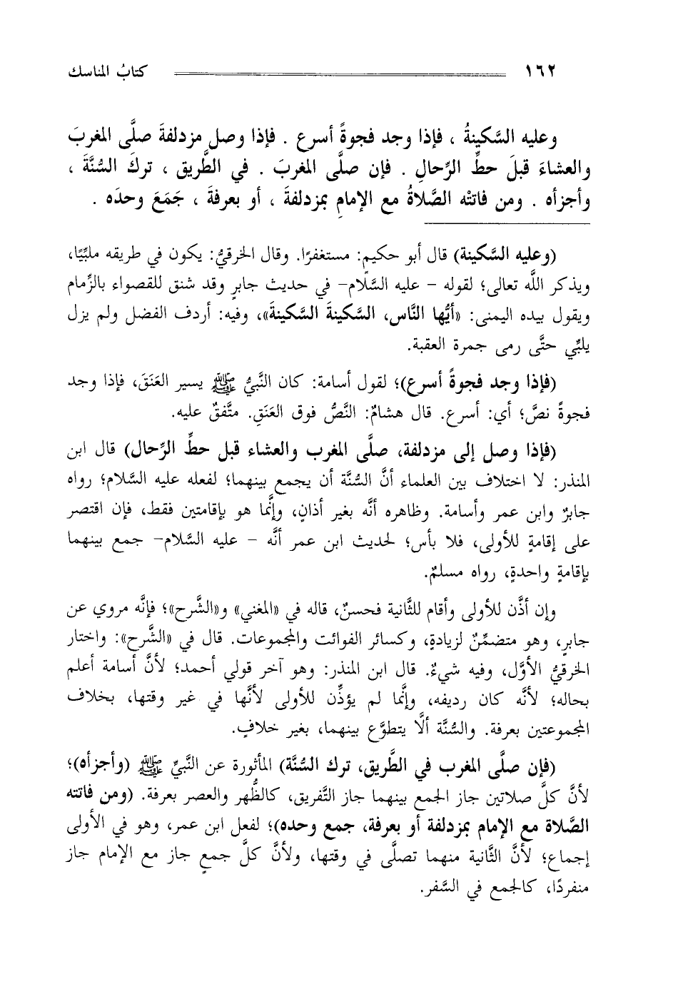 وعليه السكينة فإذا وجد فجوة أسرع فإذا وصل مزدلفة صلى المغرب والعشاء قبل حط الرحال فإن صلى المغرب في الطريق ترك السنة وأجزأه ومن فاتته الصلاة مع الإمام بمزدلفة أو بعرفة جمع وحده.