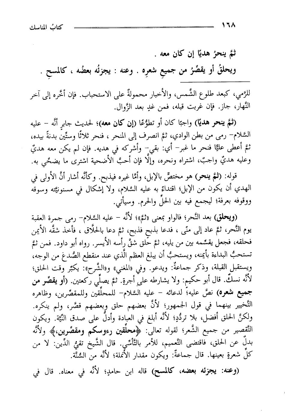 "ويحلق" بعد النحر فالواو بمعنى "ثم" لأنه عليه السلام رمى جمرة العقبة يوم النحر ثم عاد إلى منى فدعا بذبح فذبح ثم دعا بالحلاق فأخذ شقه الأيمن فحلقه فجعل يقسمه بين من يليه ثم حلق شق رأسه الأيسر رواه أبو داود فمن ثم تستحب البداءة بأيمنه ويستحب أن يبلغ العظم الذي عند منقطع الصدغ من الوجه ويستقبل القبلة وذكر جماعة ويدعو وفي "المغني" و"الشرح": يكبر وقت الحلق لأنه نسك قال أبو حكيم ولا يشارطه على أجرة ثم يصلي ركعتين "أو يقصر من جميع شعره" نص عليه لدعائه عليه السلام للمحلقين وللمقصرين وظاهره التخيير بينهما في قول الجمهور لأن بعضهم حلق وبعضهم قصر ولم ينكره ولكن الحلق أفضل بلا تردد لأنه أبلغ في العبادة وأدل على صدق النية ويكون التقصير من جميع الشعر لقوله تعالى: {مُحَلِّقِينَ رُؤُوسَكُمْ وَمُقَصِّرِينَ} ولأنه بدل عن الحلق فاقتضى التعميم للأمر بالتأسي قال الشيخ تقي الدين لا من كل شعرة بعينها قال جماعة ويكون مقدار الأنملة لأنه من السنة.
