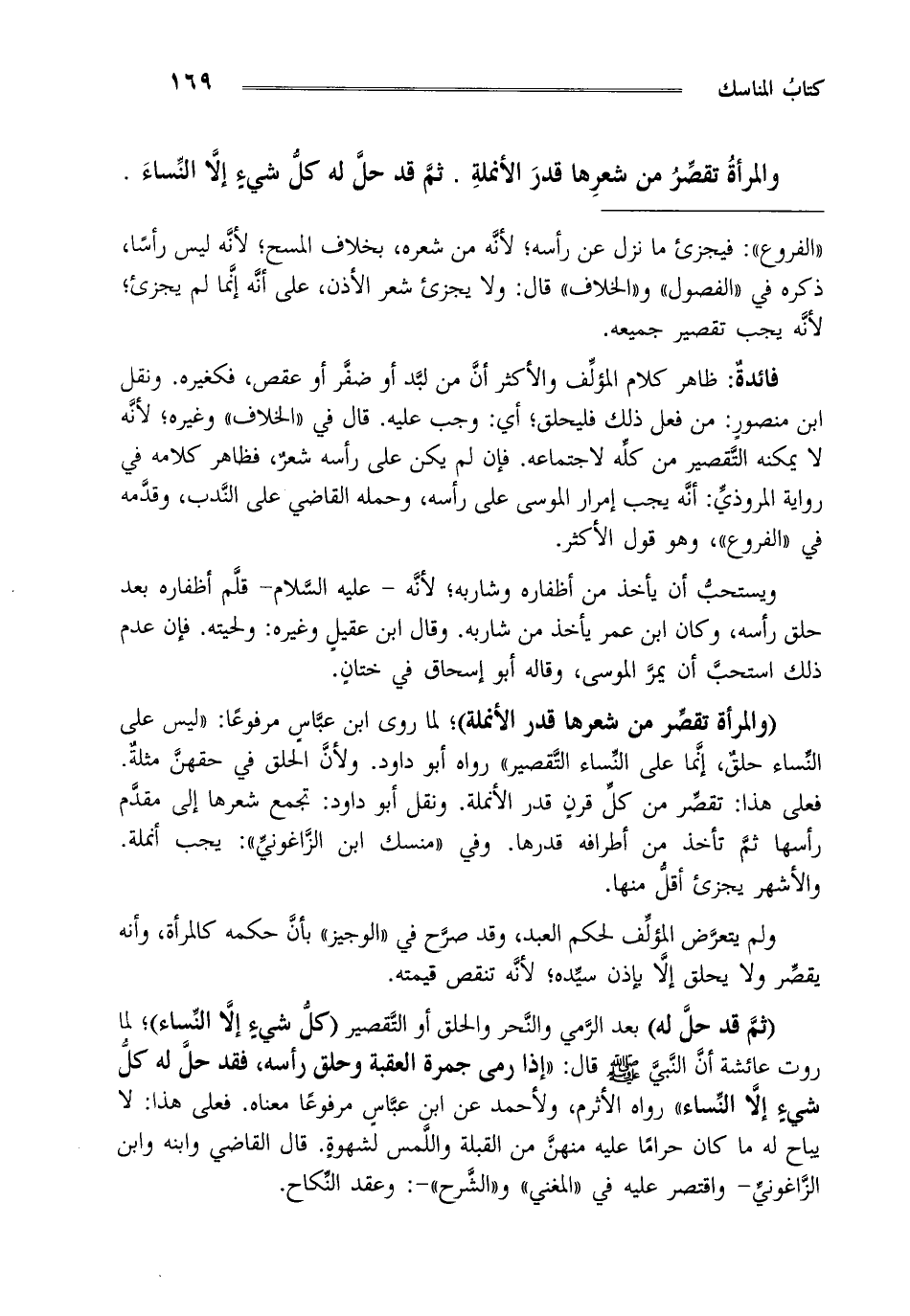 "والمرأة تقصر من شعرها قدر الأنملة" لما روى ابن عباس مرفوعا: "ليس على النساء حلق إنما على النساء التقصير" رواه أبو داود. ولأن الحلق في حقهن مثلة فعلى هذا تقصر من كل قرن قدر الأنملة ونقل أبو داود تجمع شعرها إلى مقدم رأسها ثم تأخذ من أطرافه قدرها وفي "منسك ابن الزاغوني": يجب أنملة والأشهر يجزئ أقل منها.